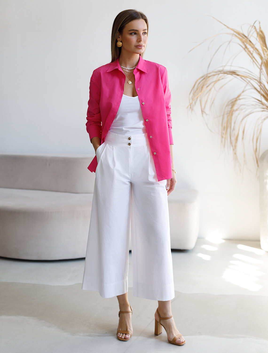 Блузка выполнена из легкого хлопкового поплина. Лаконичная модель с высокими манжетами и пуговицами из натурального перламутра хорошо впишется в любой гардероб и внесет яркий летний акцент в образ. Натуральный состав ткани обладает высокой воздухопроницаемостью и гигроскопичностью. В изделии будет комфортно, даже в самое жаркое время года. Подходит для любой фигуры. На спинке фирменный логотип бренда.