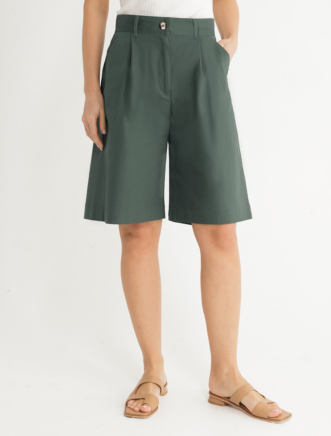 Шорты-бермуды с защипами выполнены из хлопкового твила. Длина по колено и свободный силуэт комфортны в носке, а универсальные оттенки впишутся в любой гардероб. Изделие дополнено застежкой на молнию и пуговицу, боковыми и задними карманами. Натуральный материал ткани обеспечивает высокий уровень комфорта, отличную гигроскопичность и воздухопроницаемость. Эластан в составе изделия минимизрует деформацию модели и продлевает срок носки.