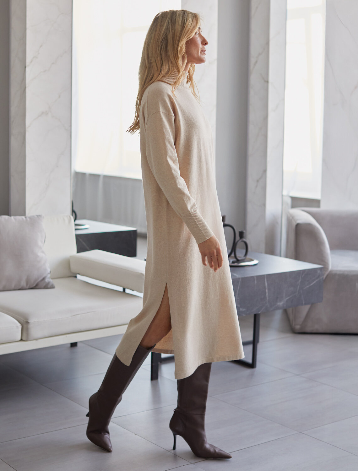 Платье тонкой вязки выполнено из хлопка. Лаконичная модель с высоким воротом дополнена манжетами и разрезами по бокам. Изделие свободно сидит по фигуре и не сковывает движений. Мягкая пряжа очень приятная к телу не колется и сохраняет тепло при этом не перегревая. Изделие дополнено металлическим логотипом бренда.