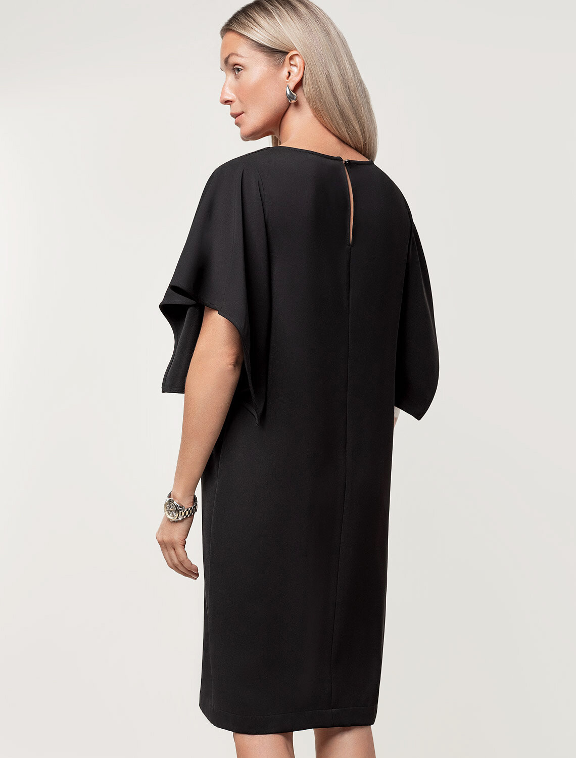 Платье из плотного струящегося крепа прямого кроя с «парящими» рукавами. Фасон платья сбалансирует любой тип фигуры: прямой свободный крой, универсальная длина подола – чуть ниже колена, широкая пройма и акцентные рукава. Классический О-образный вырез фиксируется сзади изящной золотой пуговицей. Материал почти не мнется и комфортен в носке.
