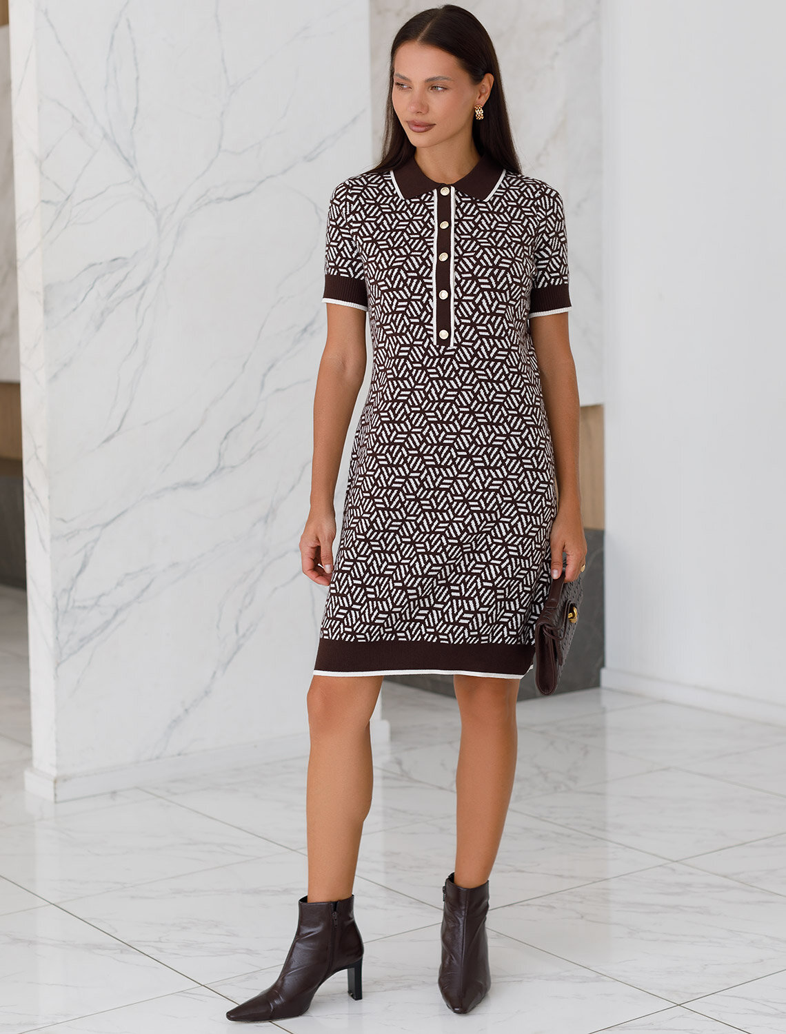 Платье жаккардовой вязки выполнено из нежной пряжи на основе вискозы с добавлением кашемира. Модель прямого силуэта с застежкой планкой как у поло. Фигурные золотистые пуговицы вносят изысканности и роскоши. Изделие приятно ощущается на теле и поддерживает комфортный микроклимат. Сочетается в комплекте total-look с жакетом D31.150