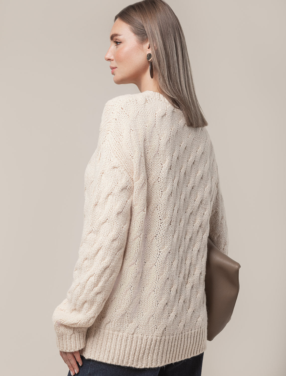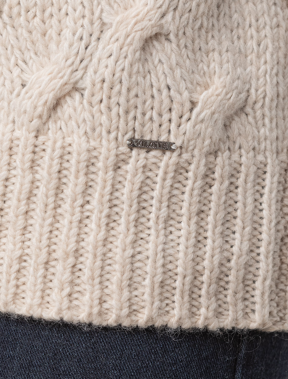 Джемпер в овсяном оттенке выполнен из уютной пряжи крупной вязки с ангорой и легким пушистым мохером. Модель с фактурным узором косы очень приятная на ощупь, в которую хочется укутаться. Отлично согревает, а свободный силуэт позволяет носить изделие на футболку или рубашку. Из украшений металлический логотип бренда.