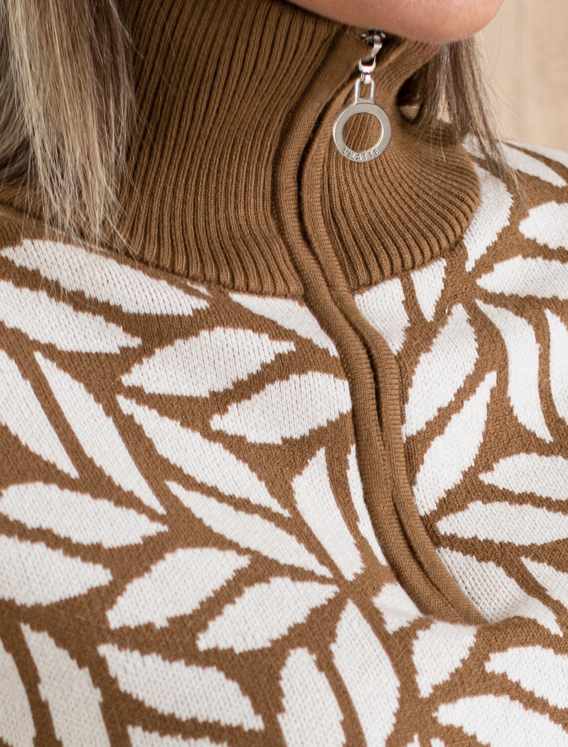 Джемпер с воротом на молнии двуслойной жаккардовой вязки выполнен из нежной пряжи на основе вискозы с добавлением кашемира. Мягкая модель с золотистой фурнитурой не раздражает кожу, приятно ощущается на теле и поддерживает комфортный микроклимат. Совет стилиста: такой джемпер может стать ключевым акцентом в сдержанном комплекте. Выбирайте однотонные низы в тон рибаны или на контрасте.
