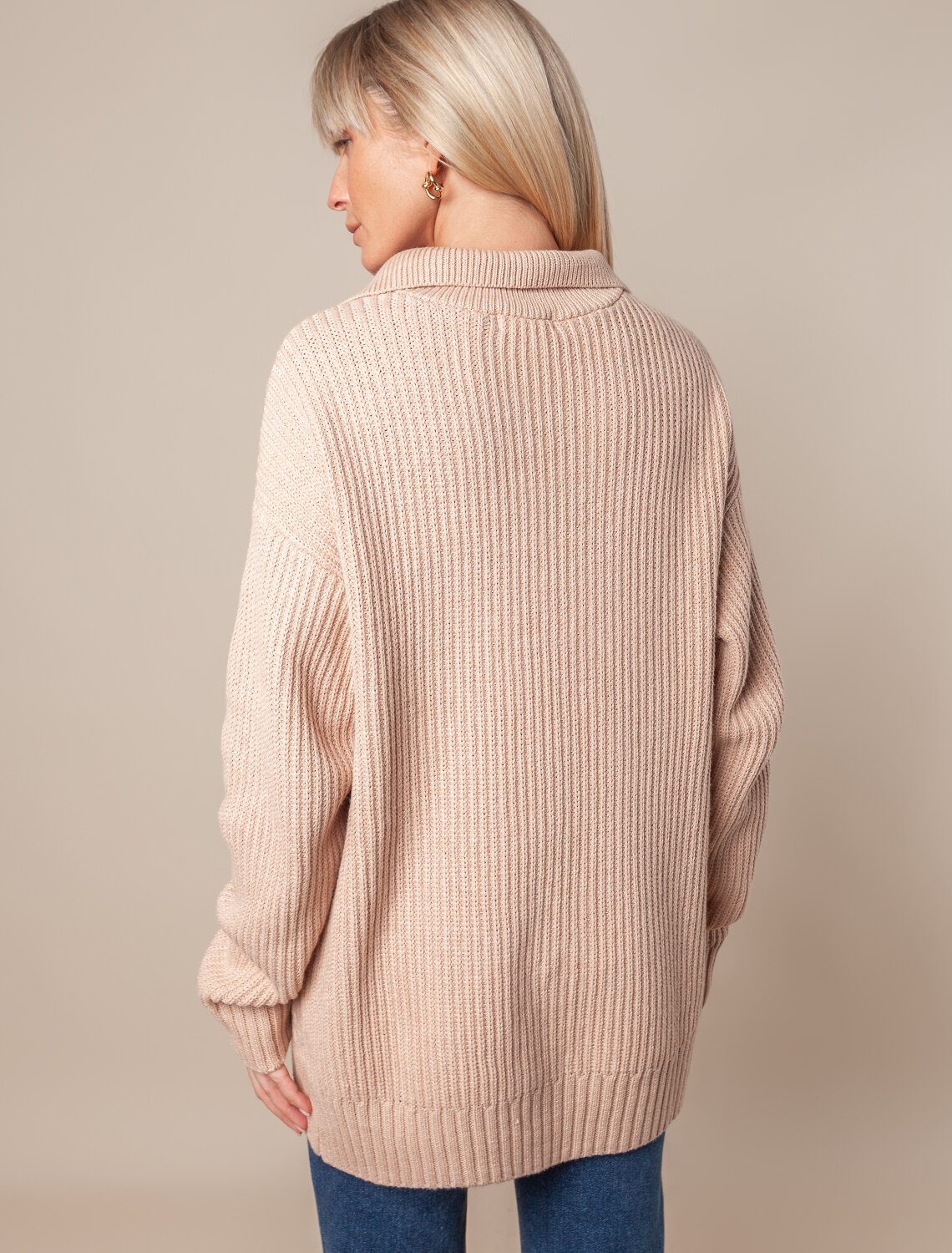 Свитер выполнен из хлопковой пряжи узором косы. Добавление акрила в состав, способствует непревзойденному теплу, мягкости и долговечности изделия. Модель дополнена декоративной вставкой спереди и высоким воротником на золотистой молнии. Теплая и очень уютная модель, хорошо сочетается с брюками из эко-кожи и джинсами.