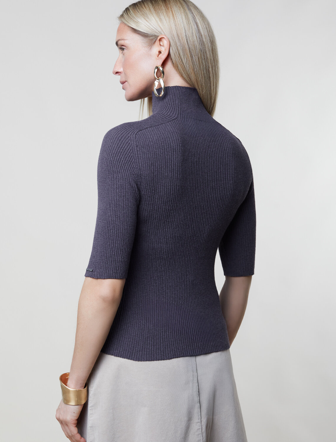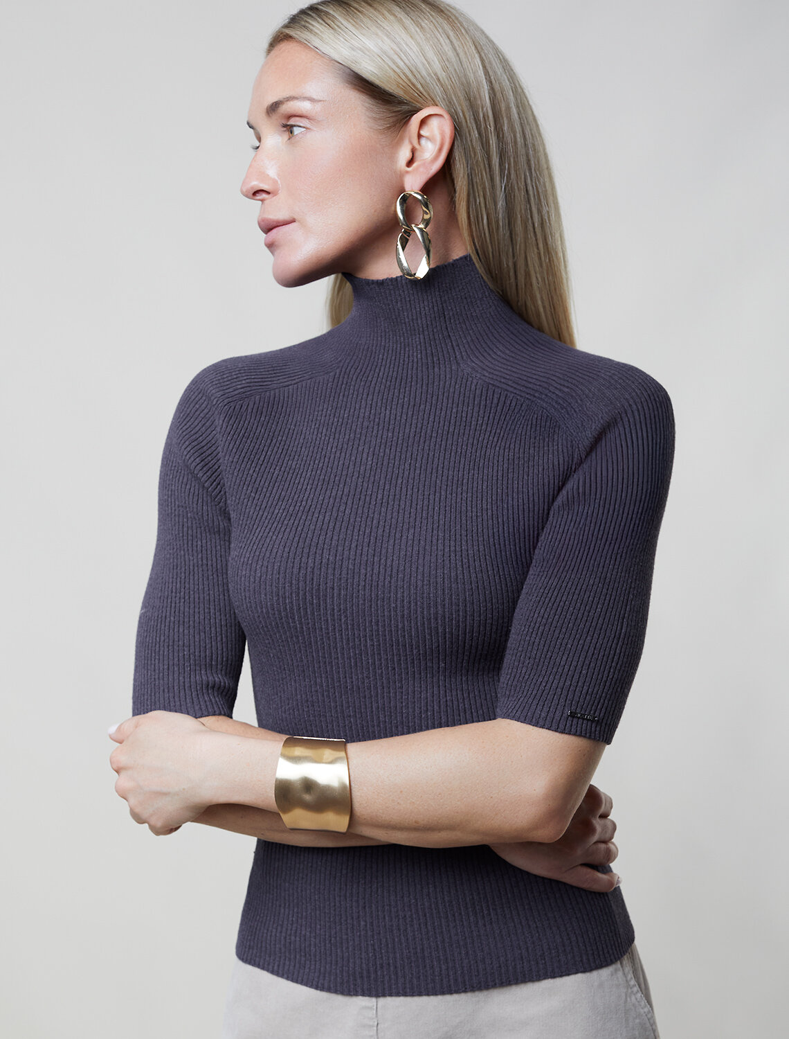Водолазка тонкой вязки в рубчик выполнена из хлопка. Лаконичная модель с коротким рукавом дополнена металлическим логотипом бренда. Изделие идеально сидит по фигуре и не сковывает движений. Мягкая пряжа очень приятная к телу не колется и сохраняет тепло при этом не перегревая.