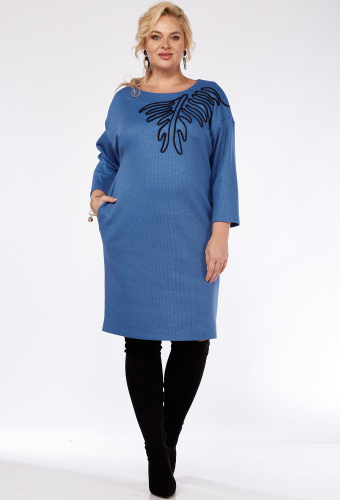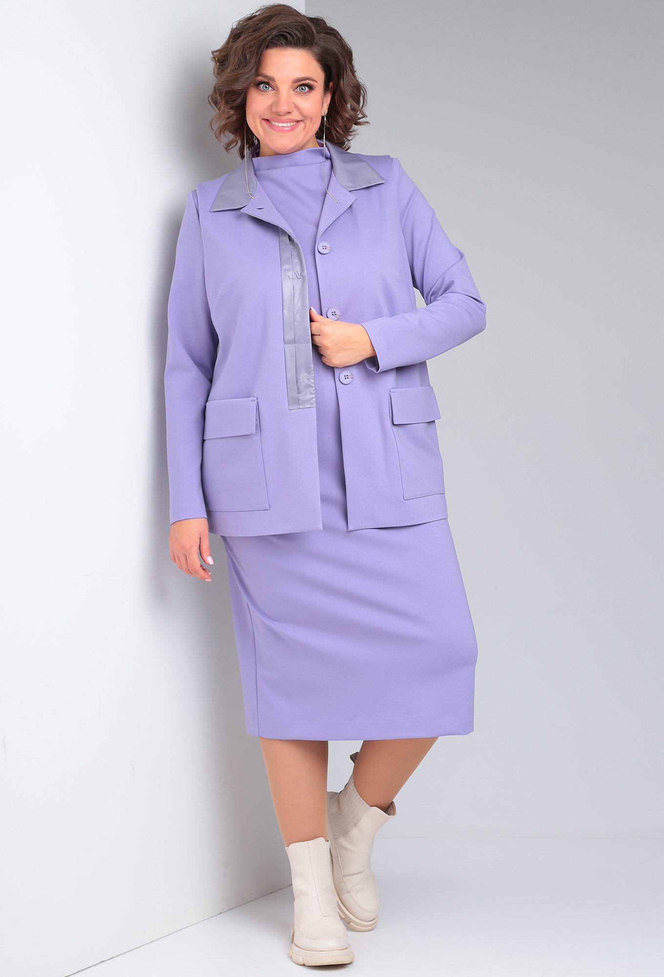 Костюм женский двухпредметный, состоящий из платья и жилета из трикотажного полотна с отделкой из плащёвки. Жилет женский полуприлегающего силуэта длиной до бёдер с центральной декоративной застёжкой с подрезом на 4 петли-пуговицы. По переду обработаны нагрудные вытачки, идущие из бокового шва и накладные карманы, имитирующие клапан. Спинка со средним швом. Воротник отложной. Жилет на подкладке. Платье женское, слегка зауженное к низу, полуприлегающего силуэта, длиной до колена с цельнокроеным воротником-стойкой. По деталям переда обработаны нагрудные вытачки. Спинка со средним швом, заканчивающимся шлицей. Рукава втачные, длинные, одношовные.