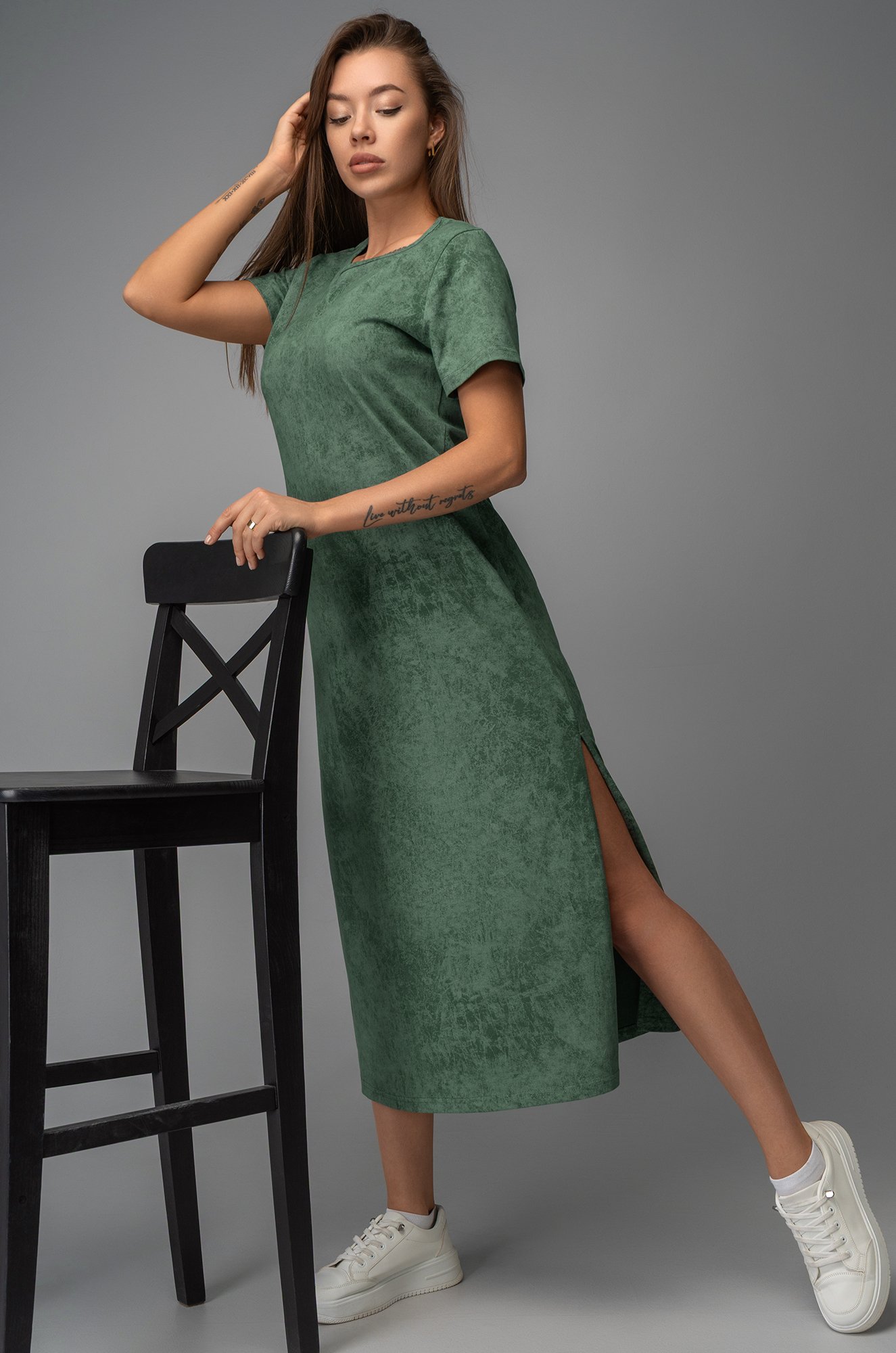 Зеленое платье миди подходит для дома. Трикотажное свободное платье подойдет на каждый день.