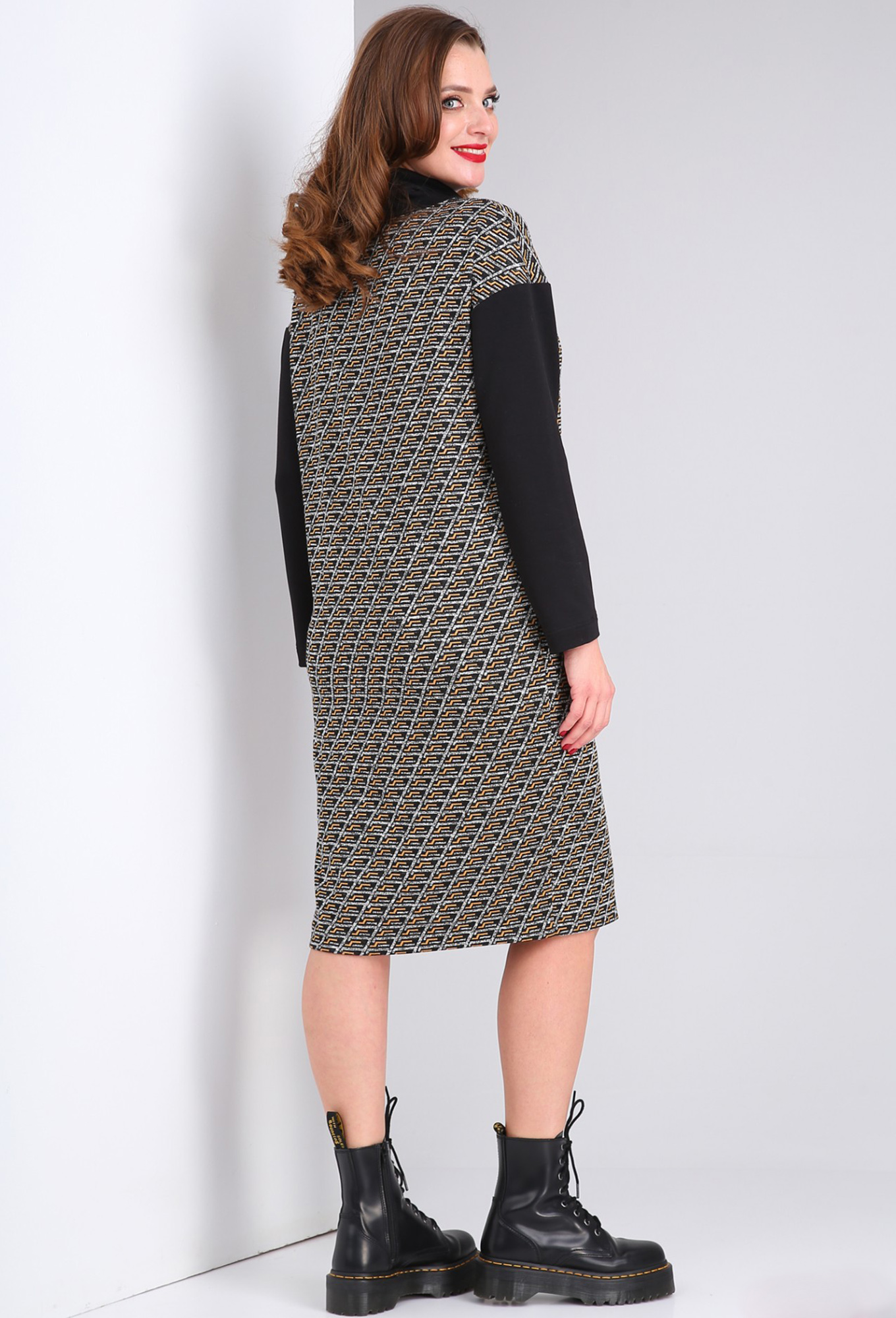 Трикотажное платье полуприлегающего силуэта с воротником-стойкой. Рукава втачные длинные, со спущенной линией плеча. По переду карманы, застёгивающиеся на декоративную пуговицу.