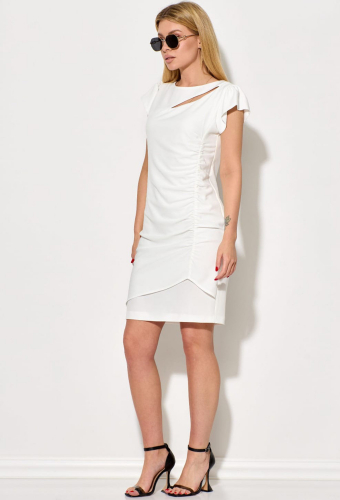 Платье женское короткое зауженная к низу прилегающего силуэта с коротким втачным рукавом крылышком по переду обработан декоративный подрез с вырезом. Платье ассиметричное по переду с отрезным бачком со сборкой с левой стороны. По спинке обработаны талиевые вытачки, спинка на подкладке. В боковом шве обработана потайная тесьма молния.