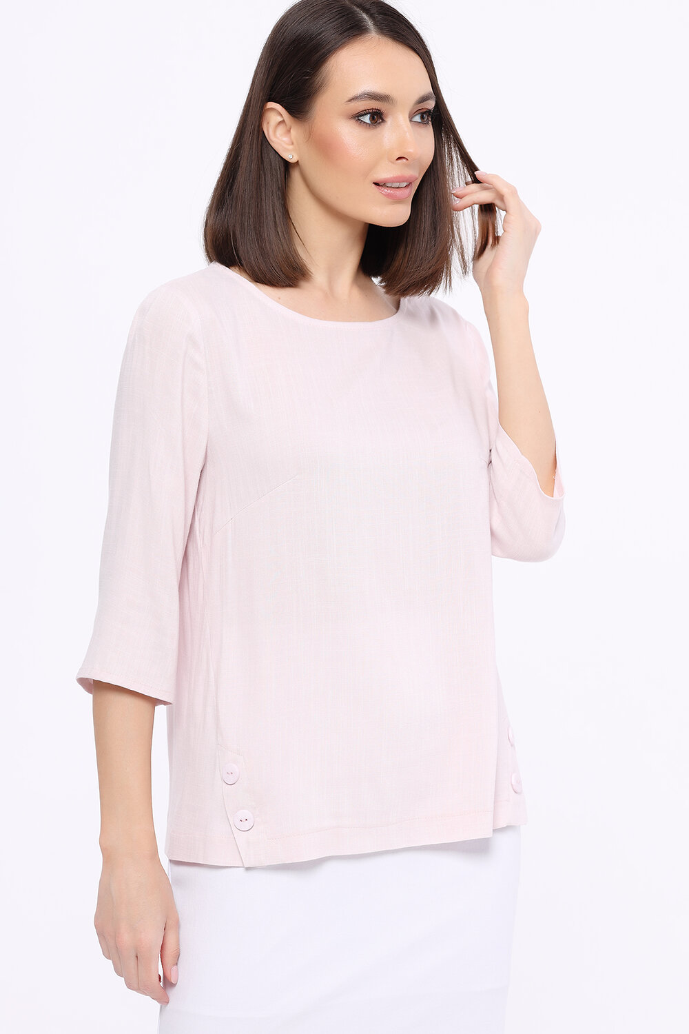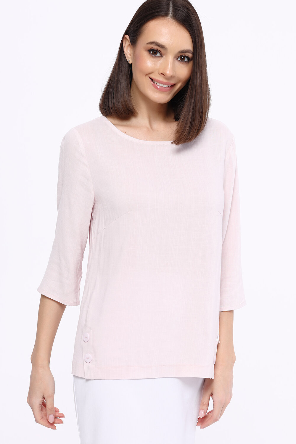 В составе блузки вискоза 50%, полиэстер 50%. Без отделки горловины. Рукав укороченный 3/4. Без застёжки. Вырез горловины - округлый. Декоративный элемент - пуговицы. Крой прямой. Рукав втачной. Блузка женская прямого силуэта. Рукав до локтя. Декоративные планки с пуговицами на передней полочке. Рекомендована стирка при температуре не более 30С.