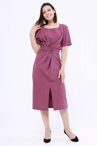 Платье женское прямого силуэта. Рукав короткий с отворотом. На полочке цельнокроеный пояс "внахлест", завязывается на спине. Спереди разрез.