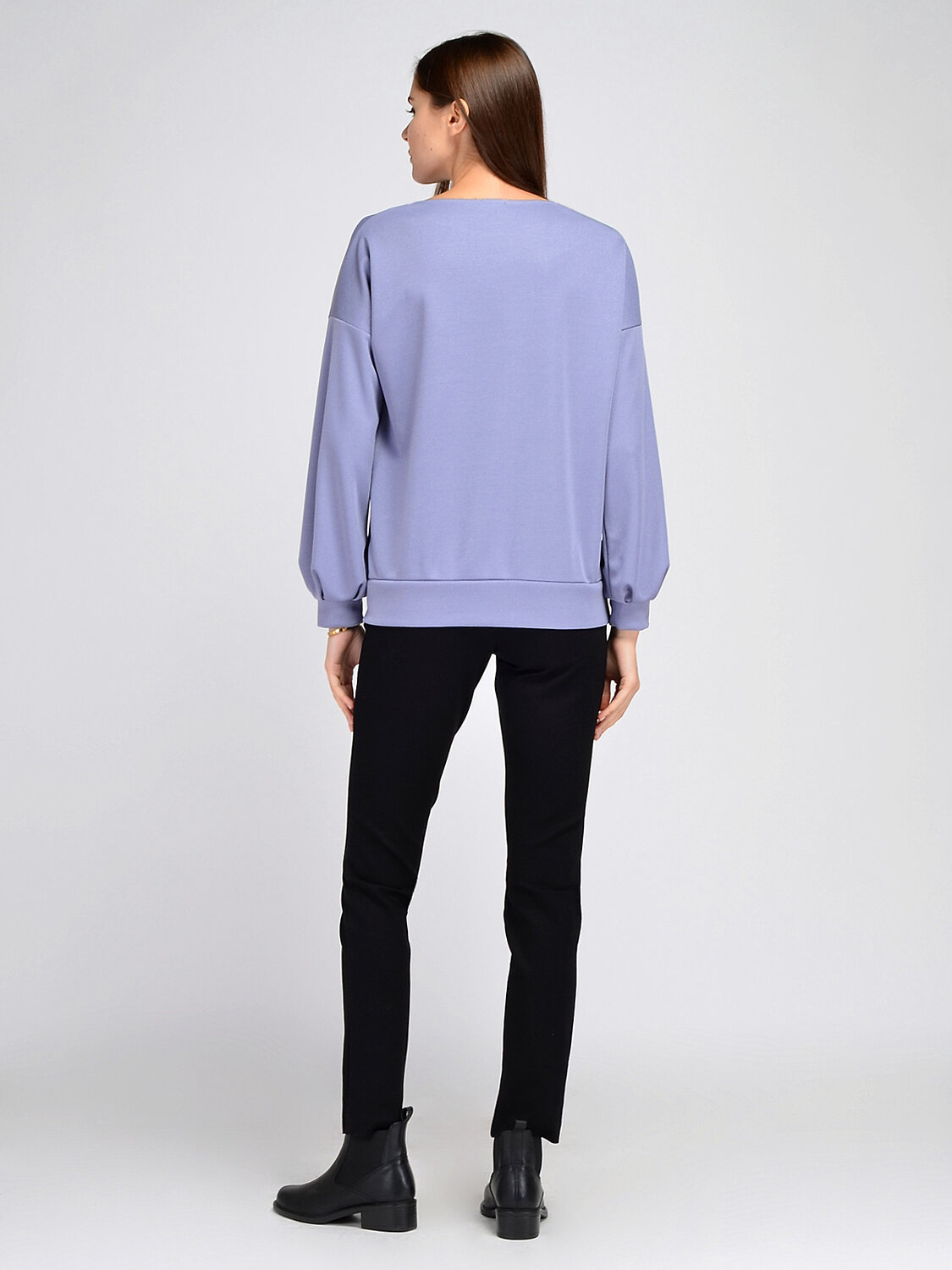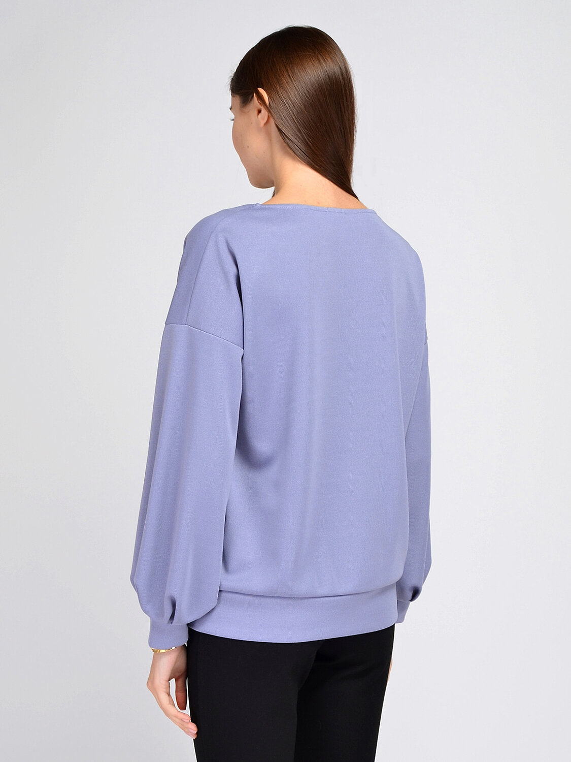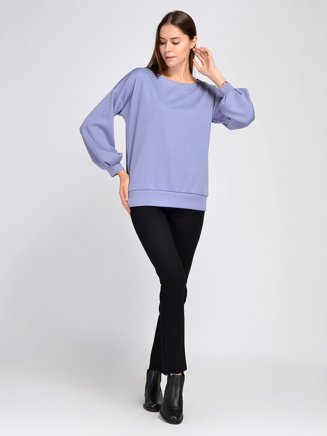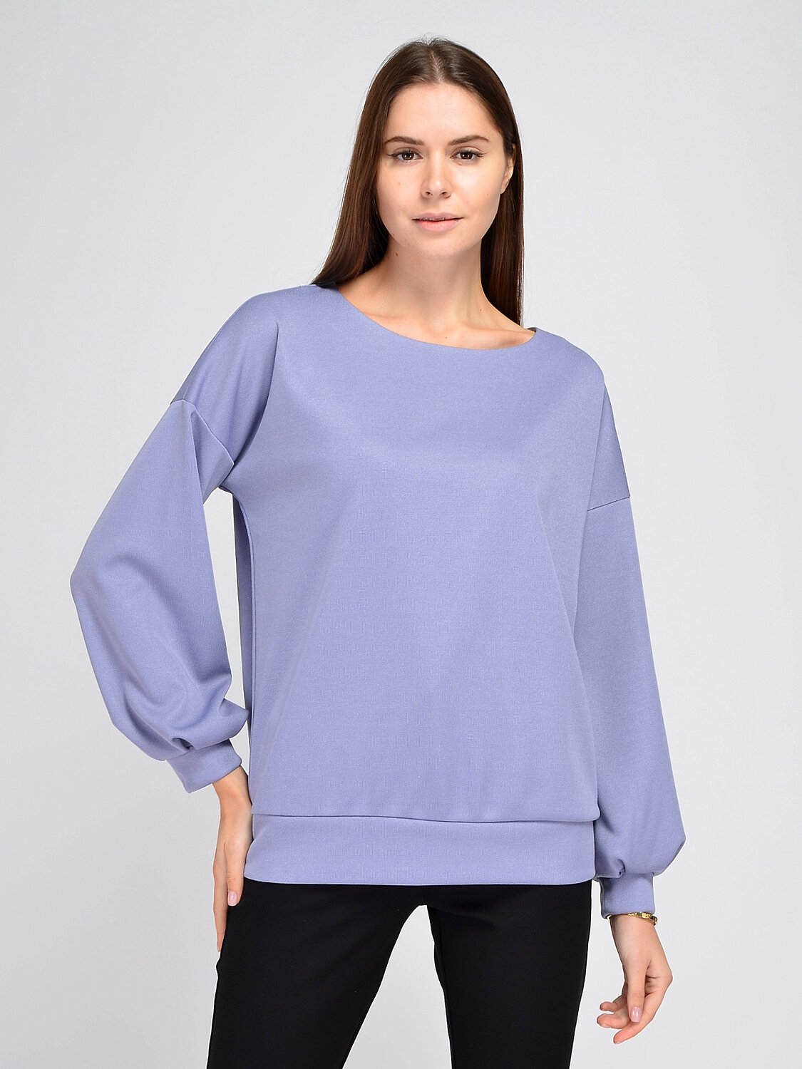 Лаконичный однотонный джемпер оверсайз поможет дополнить женственный повседневный, офисный или праздничный образ. У джемпера элегантный вырез лодочка и эффектные объемные рукава со складками.