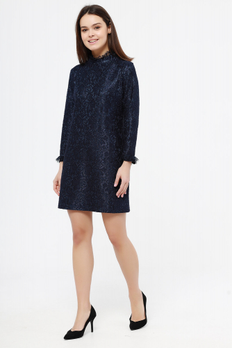 Платье женское отрезное по линии талии , клешеное. Низ юбки и верх изделия из отделочной кружевной ткани. По спинке V-образный вырез. В боковых швах карманы. Изделие с поясом