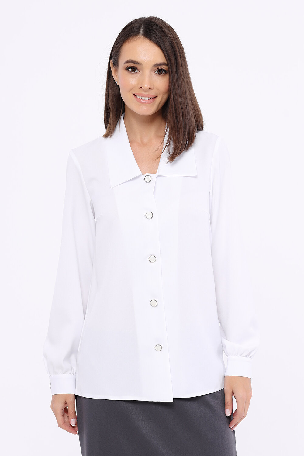Прямая блузка с фигурным вырезом.Прямая блузка с фигурным вырезом - беспроигрышный вариант для современного офисного стиля. Аккуратный отложной воротник и длинные рукава составляют строгий деликатный образ. Ткань блузки лёгкая и воздушная, что придаёт образу утончённости и элегантности. Классическая блузка на пуговицах стильно будет смотреться при любых обстоятельствах.Вырез - фигурный. Отделка горловины - воротник. Воротник отложной. Рукав длинный. Рукава втачные. Вид застёжки - пуговицы. Декоративный элемент - пуговицы. Крой прямой. Рекомендована стирка при температуре не более 30С.Дополнив блузку жакетом, юбкой карандаш или классическими брюками, Вы создадите строгий деловой образ. С помощью прямой блузки с фигурным вырезом также можно создать стильный городской образ. Заправьте её в джинсы на высокой талии, наденьте туфли с острым носом на высоком или на низком ходу.