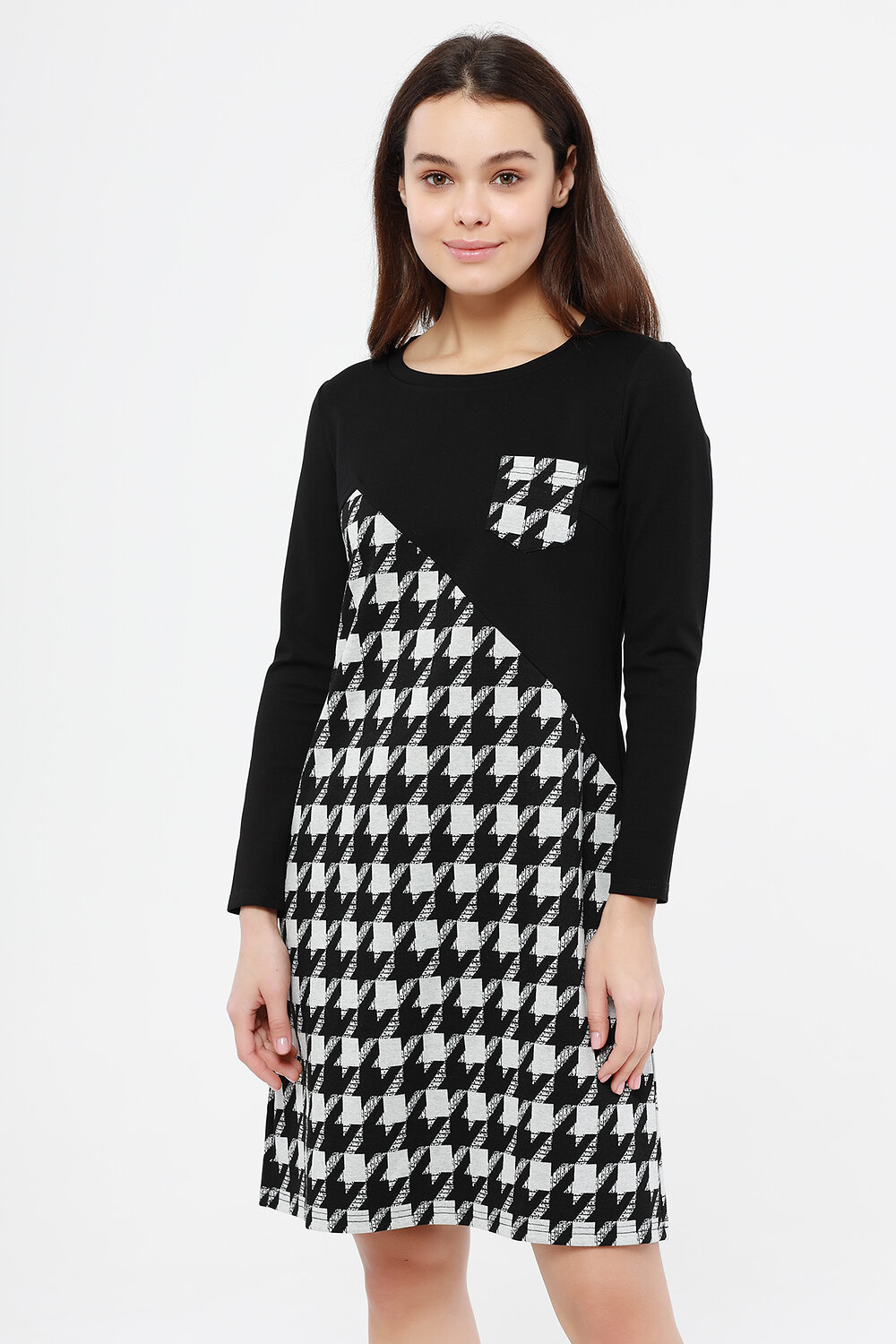 Комбинированное женское платье полуприлегающего силуэта. Рукав длинный. На полочке декоративный кармашек.