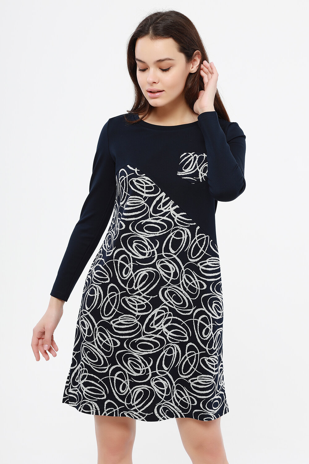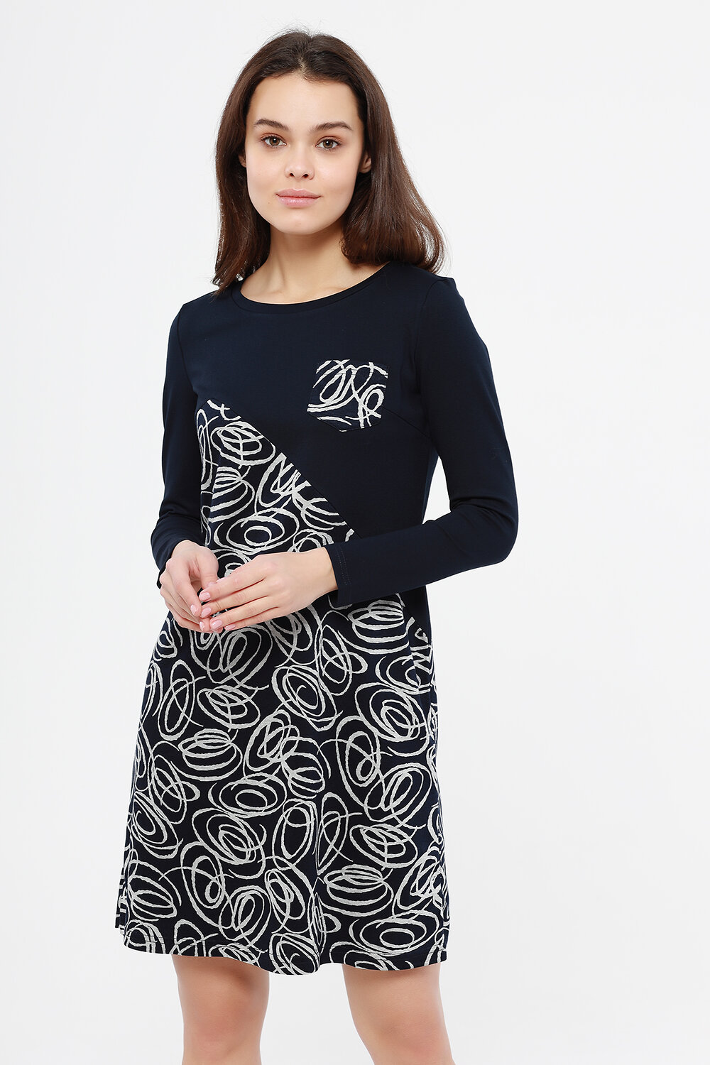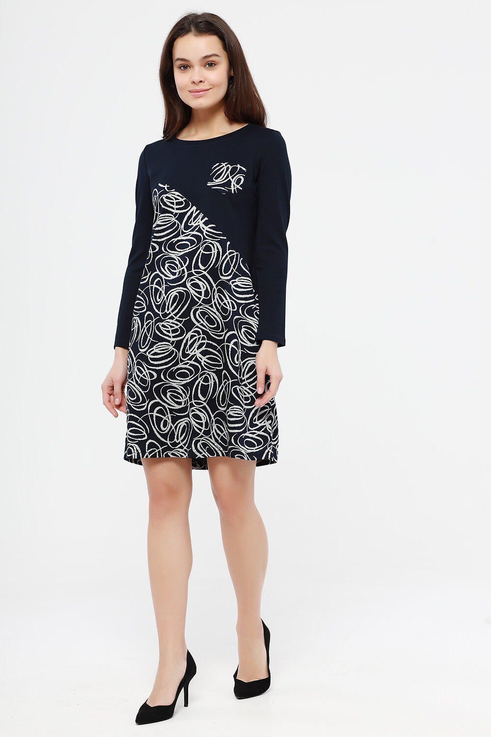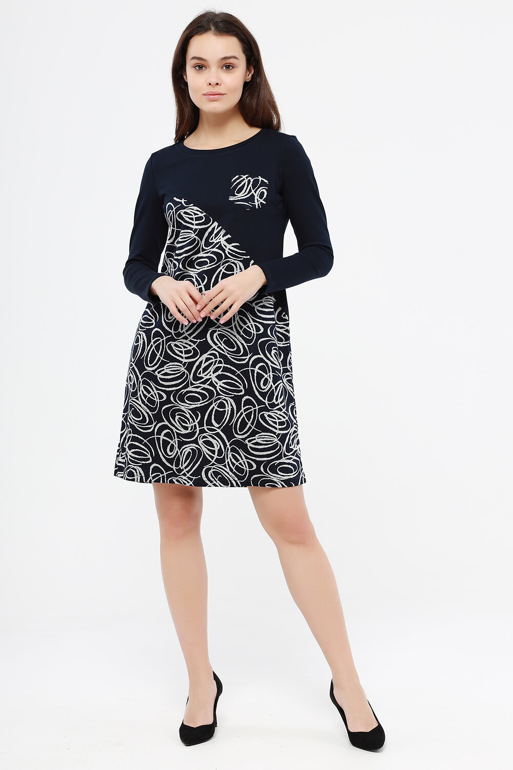 Комбинированное женское платье полуприлегающего силуэта. Рукав длинный. На полочке декоративный кармашек.