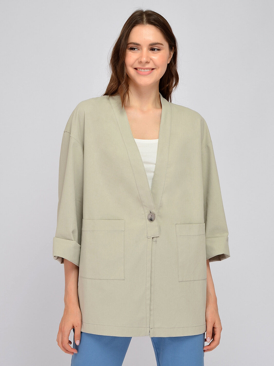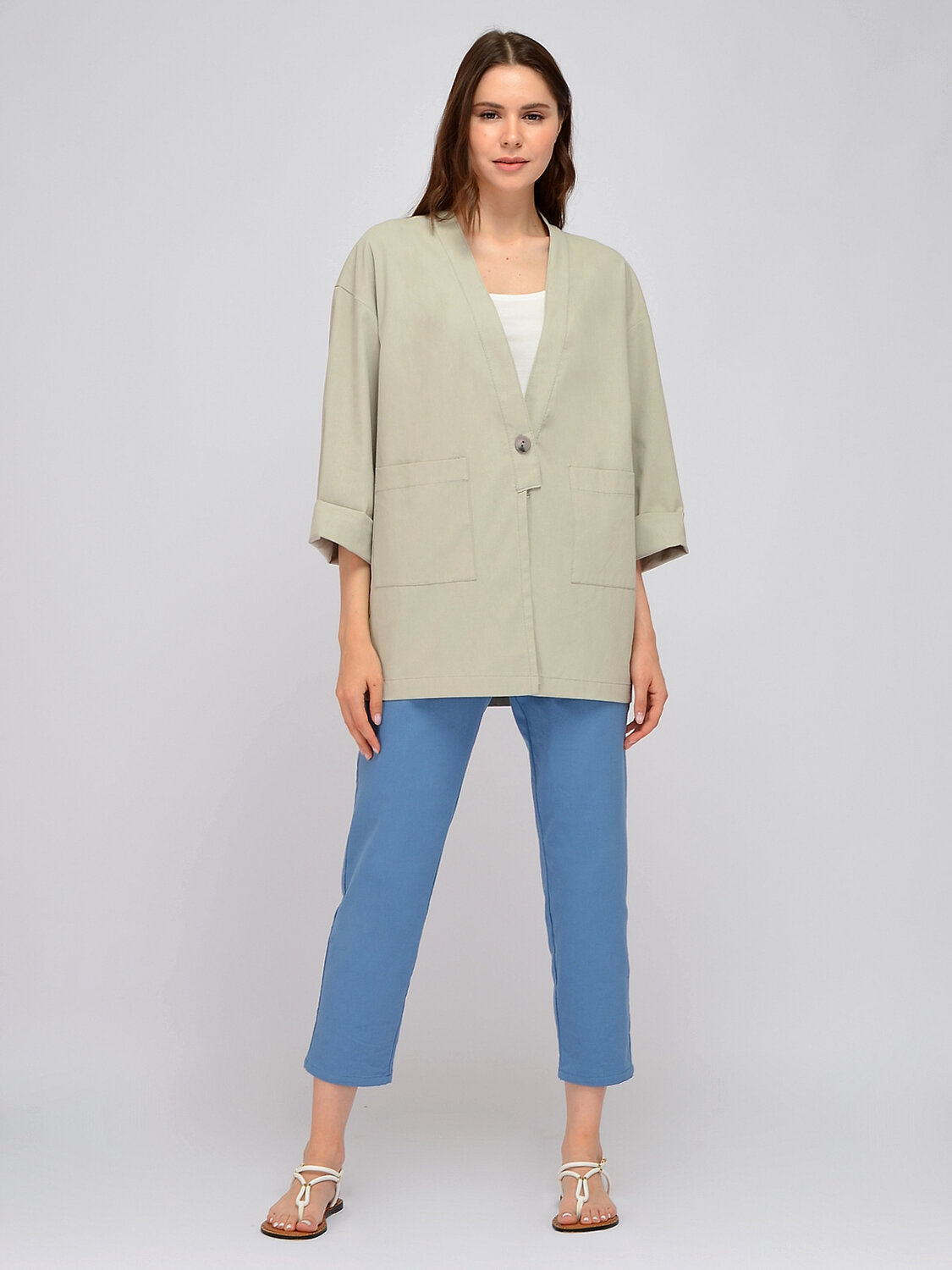 В составе жакета хлопок 100%. V-образный вырез. Без отделки горловины. Рукав длинный. Рукава втачные. Карманы накладные. Вид застёжки - пуговица. Крой прямой. Рекомендована стирка при температуре не более 30С.