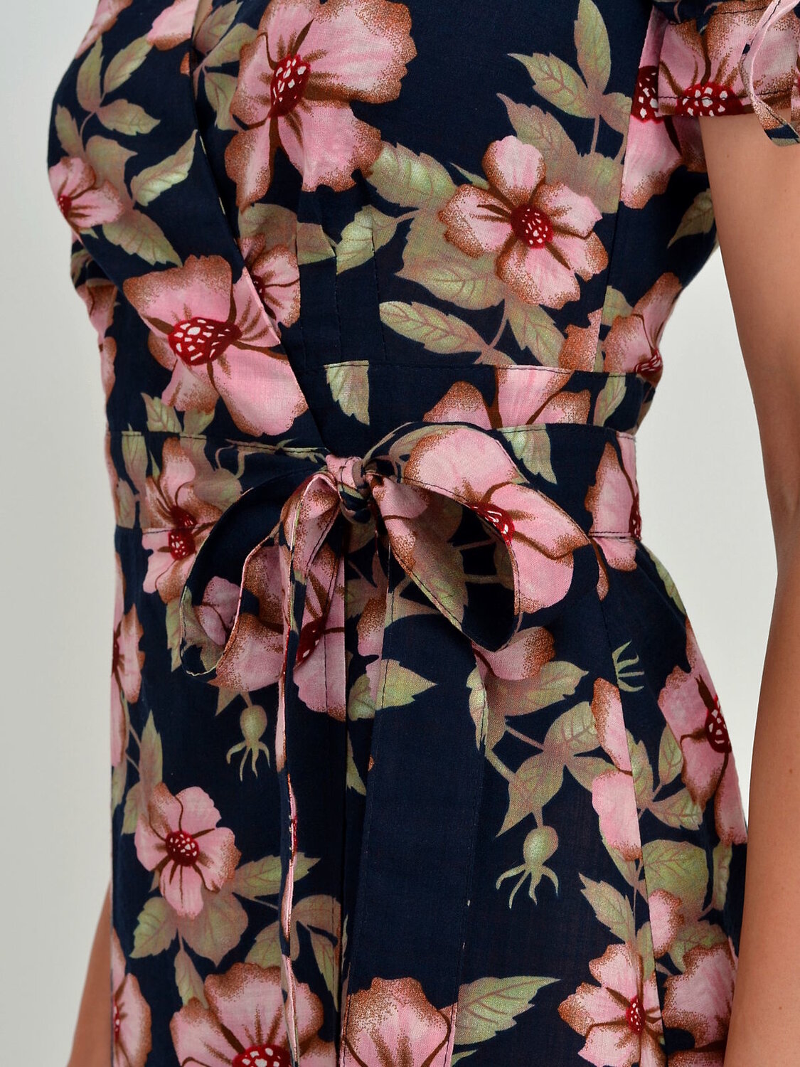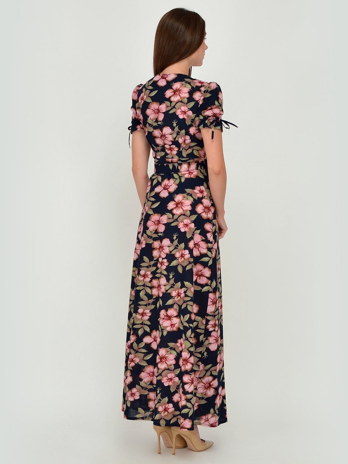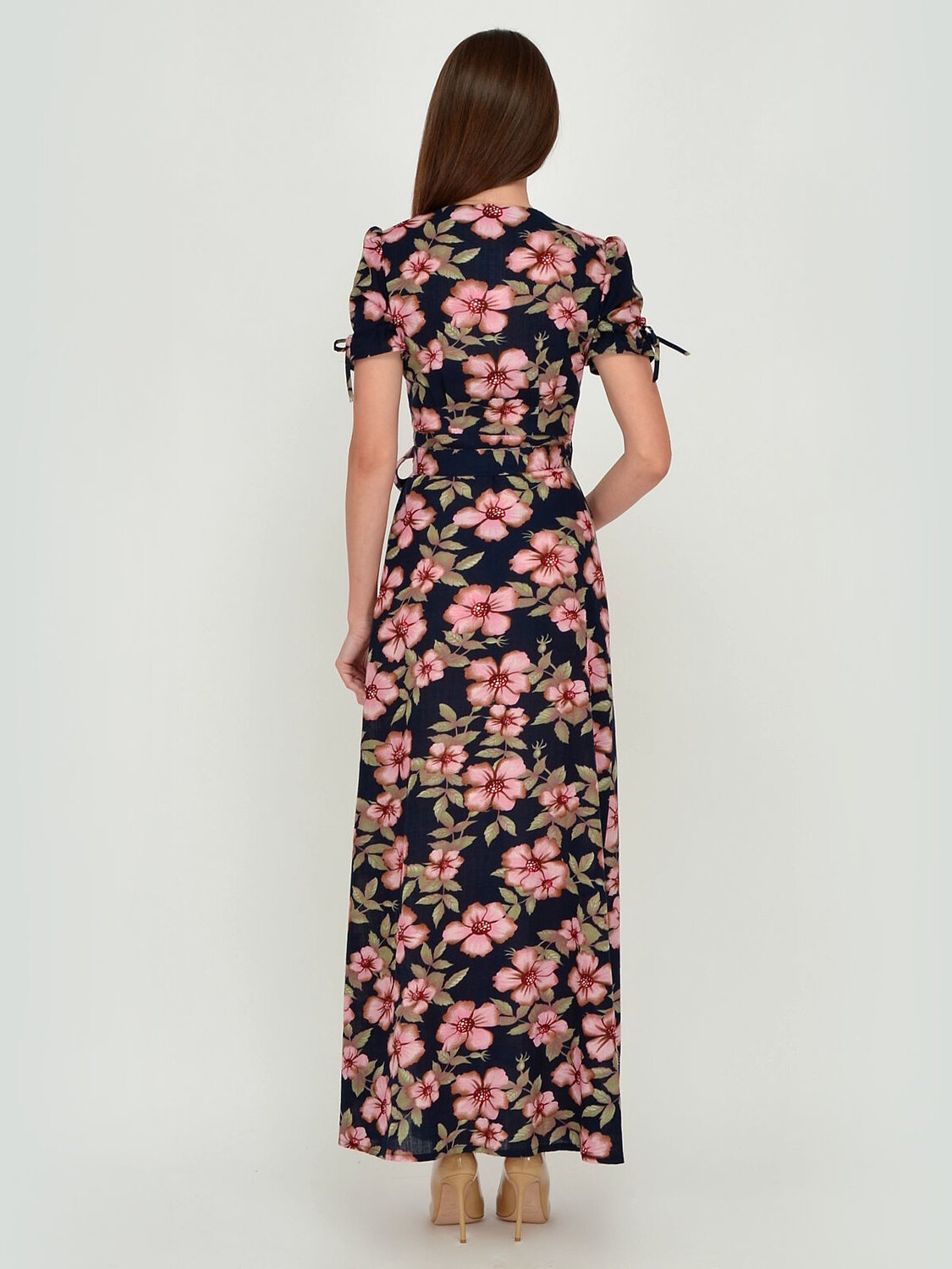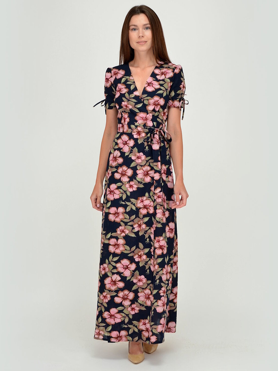 Длинное женское платье отрезное по линии талии ,с запахом. Рукав короткий.