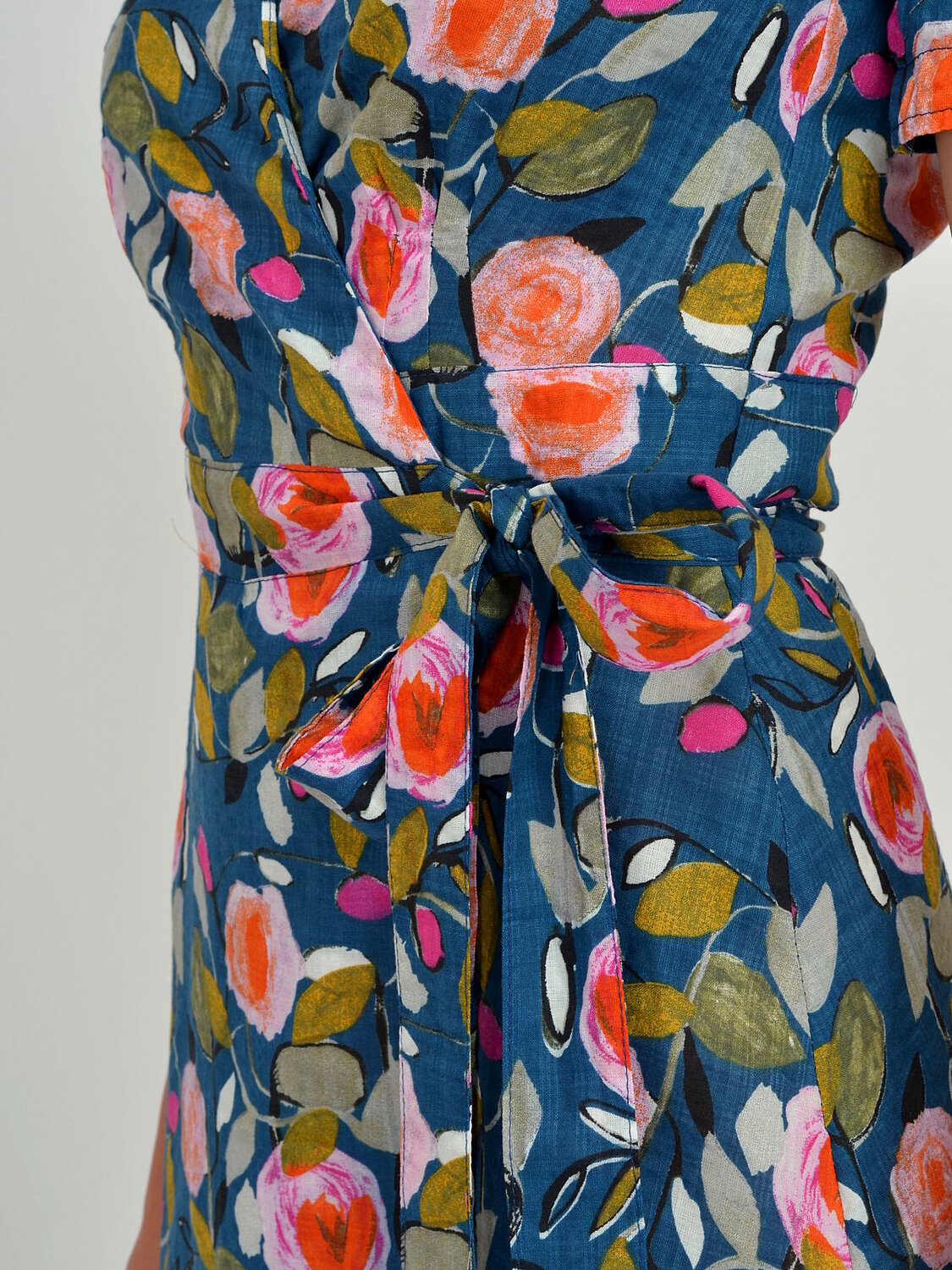 Длинное женское платье отрезное по линии талии ,с запахом. Рукав короткий.