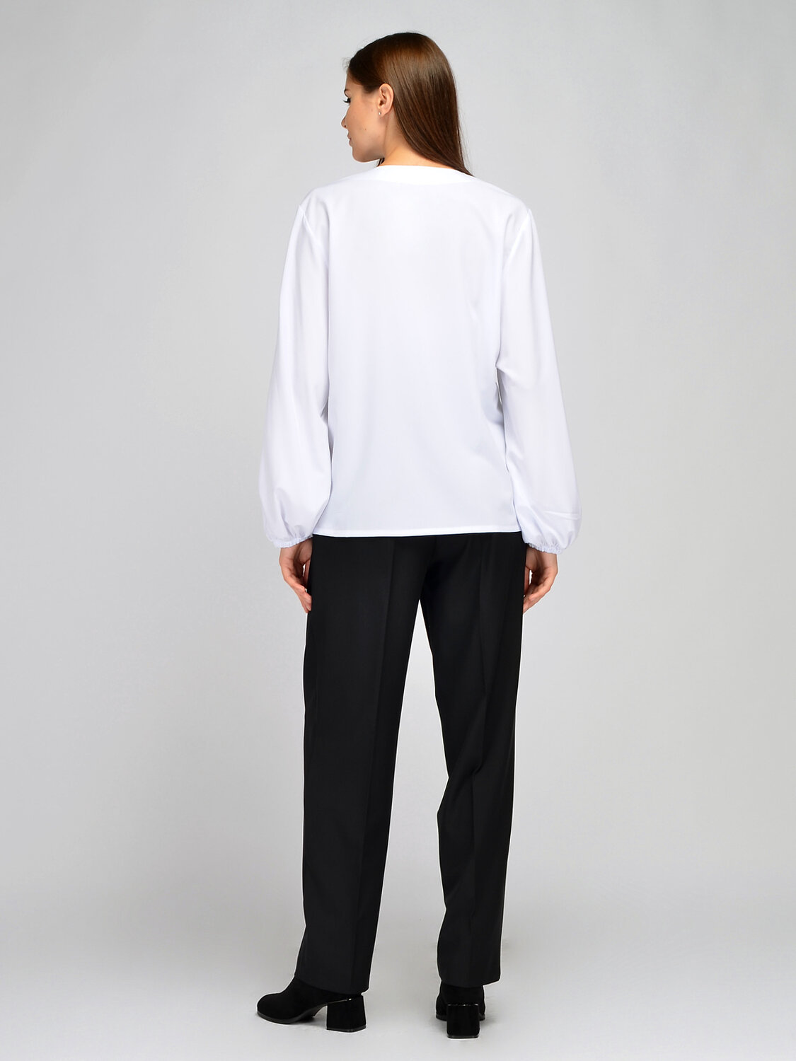 Свободная блузка с объемными рукавами придаст элегантности Вашим образам в любое время года. Изящный V-образный вырез горловины приоткрывает ключицу и позволяет интересно обыграть линию декольте шейными украшениями. Блузон застегивается на пуговицы. Широкие рукава являются главной особенностью модели. Их обрамляет нетугая резинка со складками, создавая эффект воздушности. Приталенная рубашка легко впишется в строгие, офисные или вечерние, нарядные образы. Универсальный фасон подойдет как взрослым женщинам, так и молодым девушкам, и подросткам для школы. Просторный крой поможет скрыть возможные недостатки фигуры. Если сочетать блузку с брюками или юбкой с высокой посадкой и заправить ее за пояс, Вы создадите утонченные пропорции фигуры, делая ноги еще длиннее. Классическая базовая блуза сочетается не только со строгим низом и обувью. Вы можете создать стильный образ для свидания или вечеринки, выбрав в качестве поясного изделия джинсы и дополнив образ туфлями-лодочками контрастного цвета. Не забудьте завершить свои образы украшениями и аксессуарами!