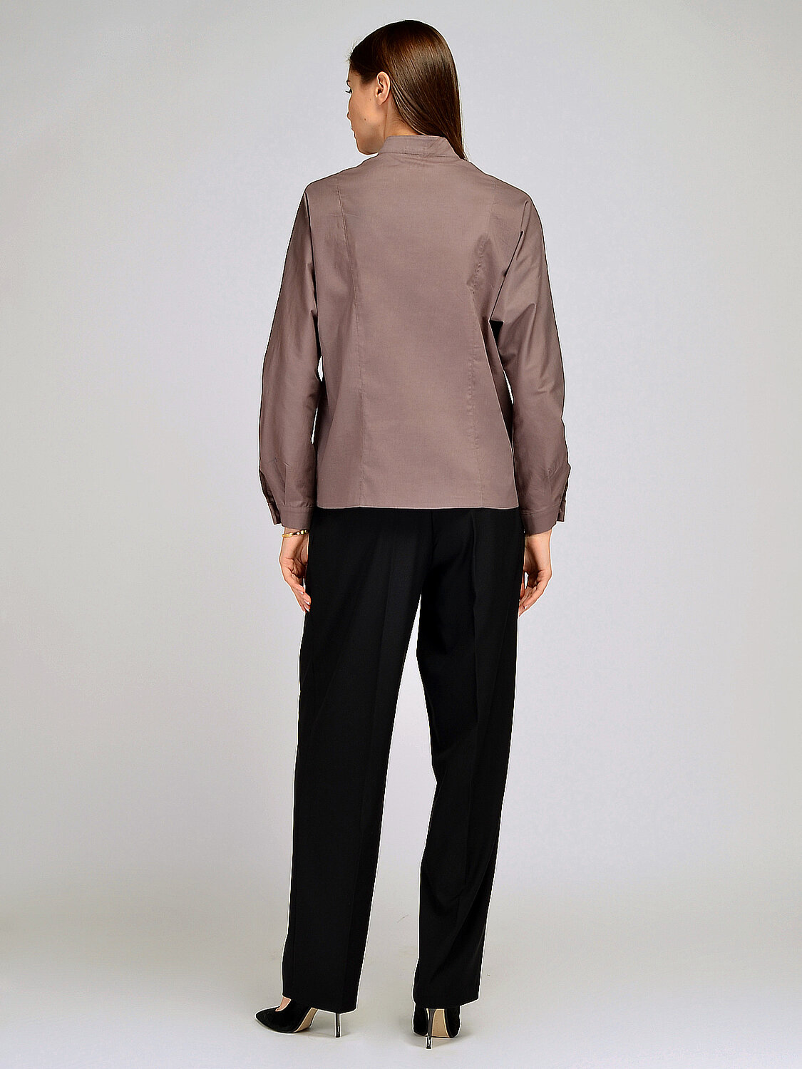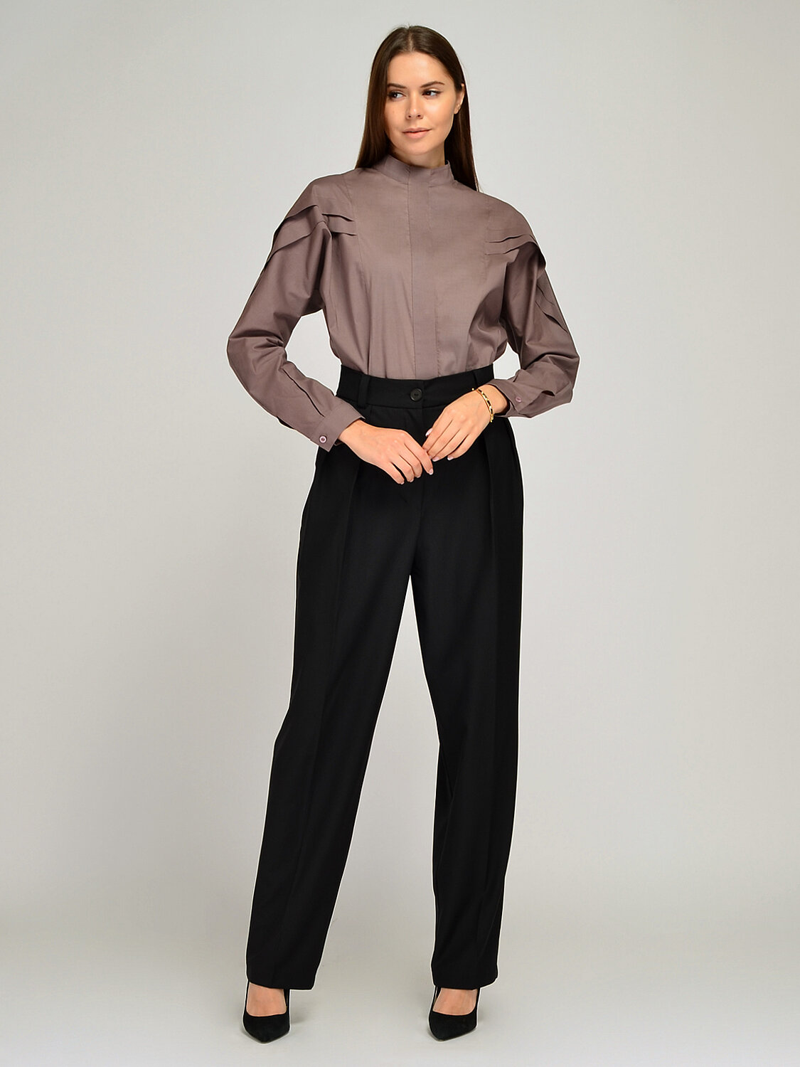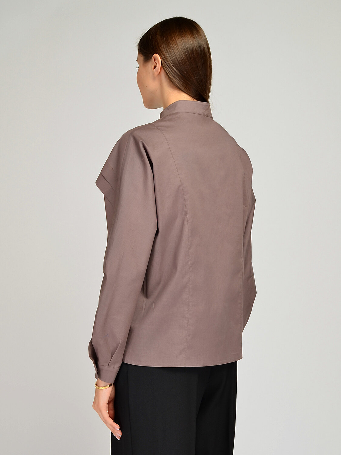 Базовая блузка рубашка оверсайз с рукавами формы летучая мышь и декоративными складками по рукавам привнесет разнообразия в классические офисные или праздничные образы. Горловина выполнена в виде воротника-стойки, застегивается блузка на потайные пуговицы. Сдержанный и при этом эффектный фасон не оставит Вас незамеченной и станет изюминкой осеннего гардероба.