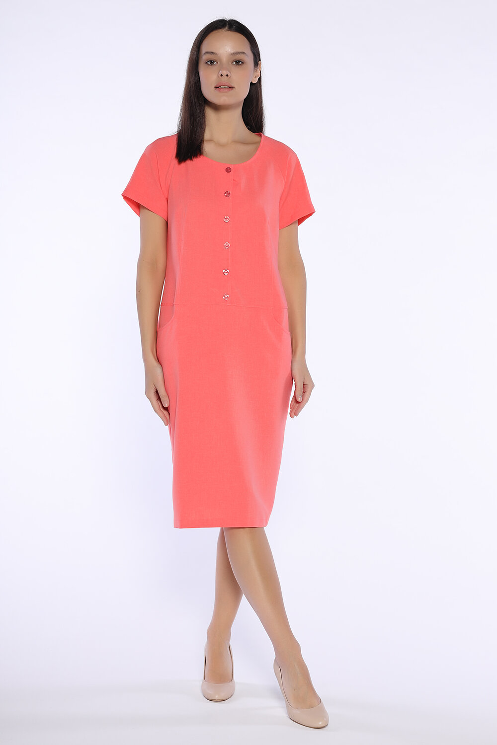 Платье миди с короткими рукавами. Лаконичное платье миди с короткими рукавами формы реглан идеально подойдёт для офисного или повседневного гардероба в теплое время года. Округлая горловина и короткие рукава обеспечивают ощущение максимального комфорта. Прямое платье миди застёгивается на пуговицы, а также на передней части платья расположены карманы в шве. Вырез горловины круглый. Без отделки горловины. Рукава короткие. Тип рукава реглан. Вид застежки пуговицы. Конструктивный элемент разрез. Крой прямой. Карманы в шве. Длина миди. Рекомендована стирка при температуре не более 30С. Платье миди с карманами гармонично дополнит и деловой образ, и повседневный, и торжественный. Обувь на высоком ходу и изящные украшения помогут создать офисный и романтичный образы. Открытая обувь на низком ходу и сумка шоппер завершат стильный городской образ в стиле кэжуал.