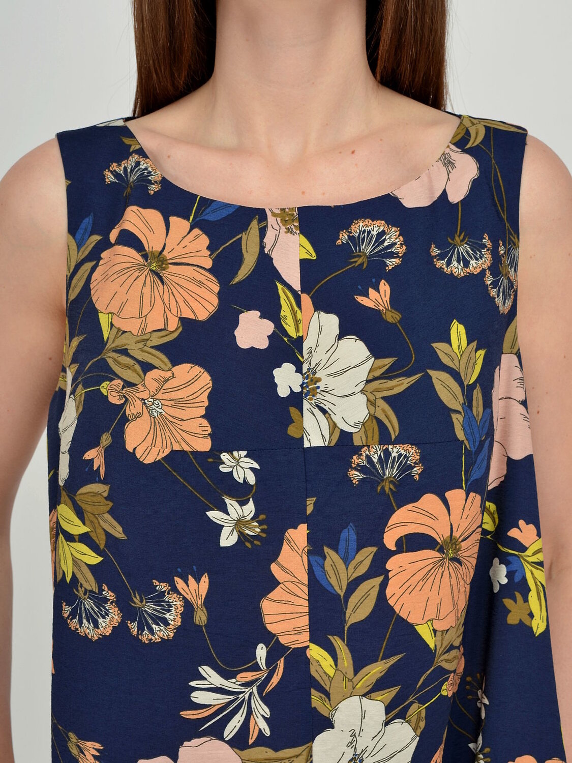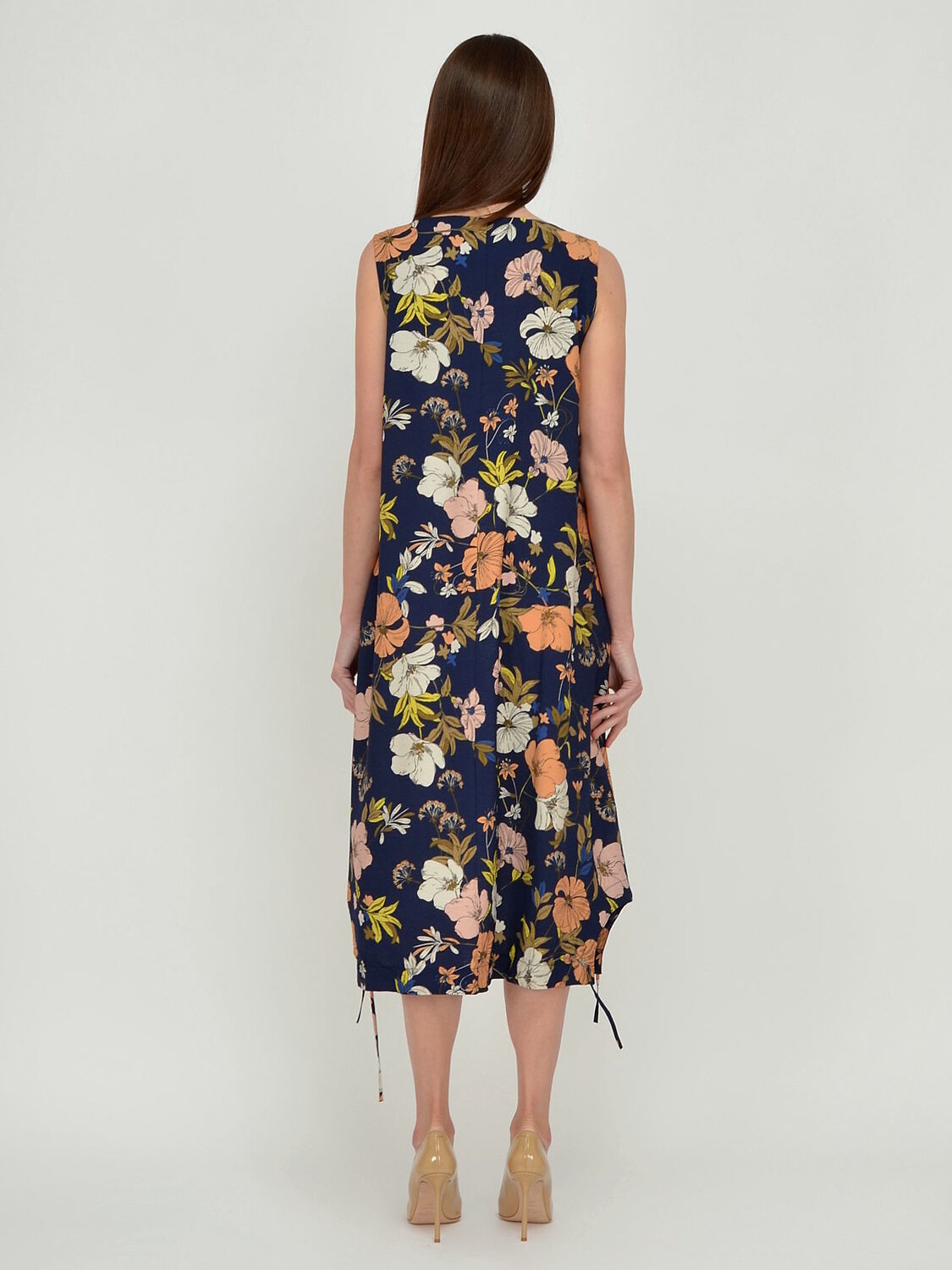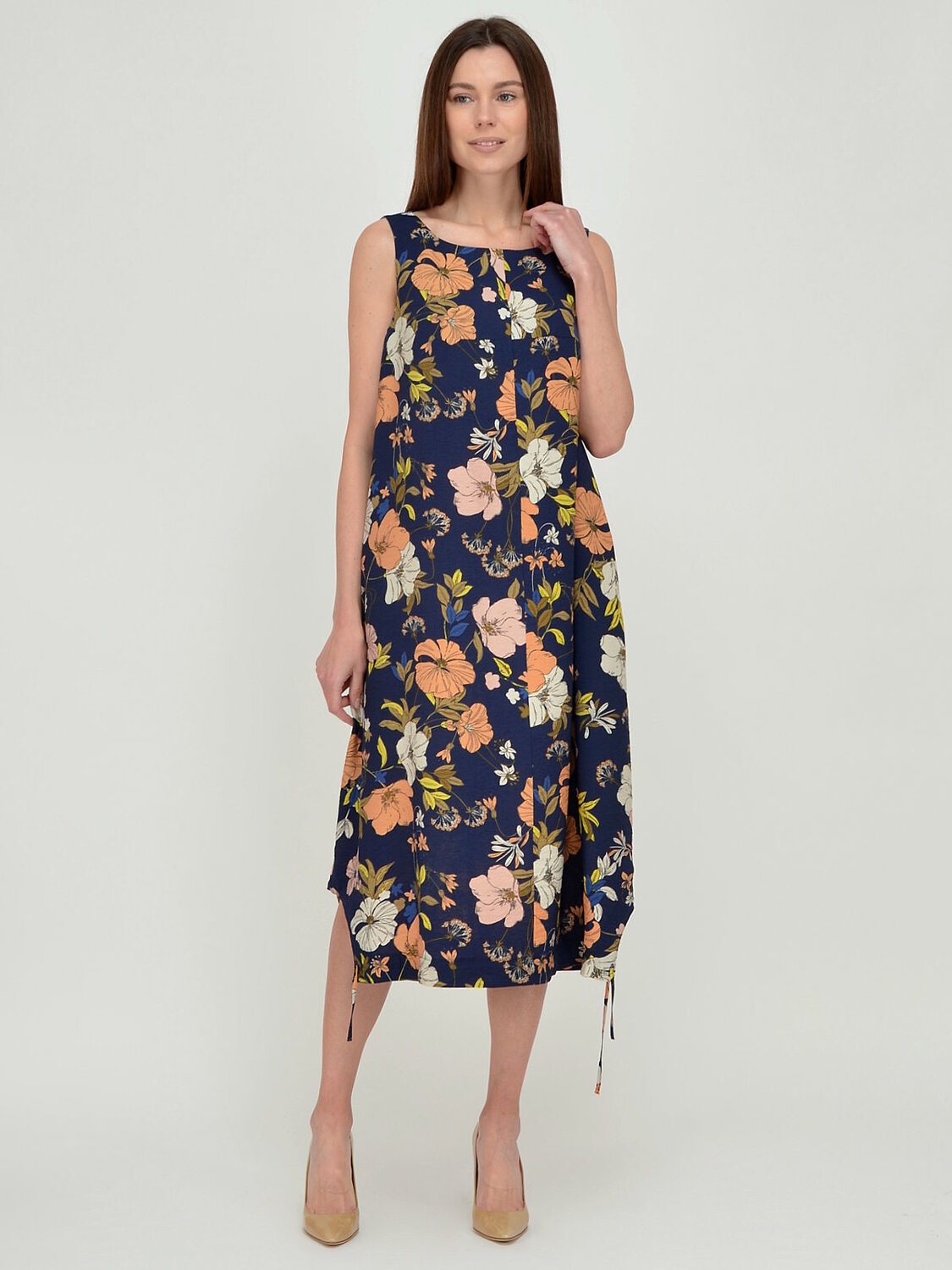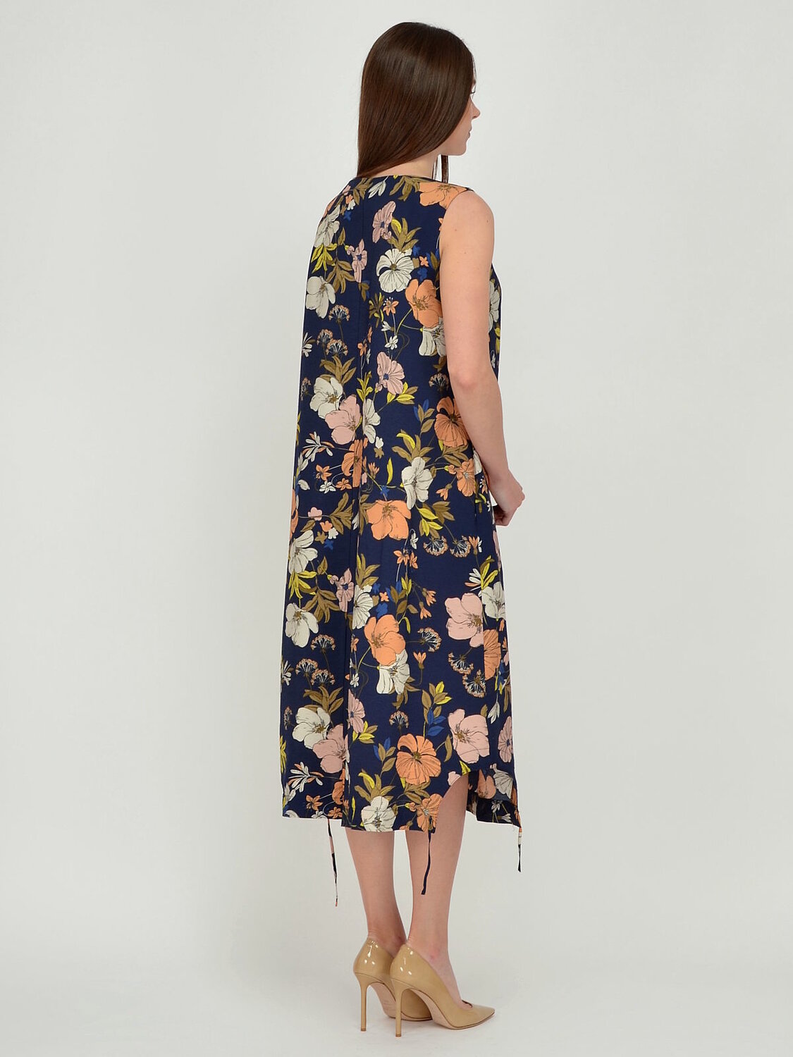 Платье женское свободного силуэта без рукавов. В боковых швах карманы. В низу разрезы с кулиской и завязками.