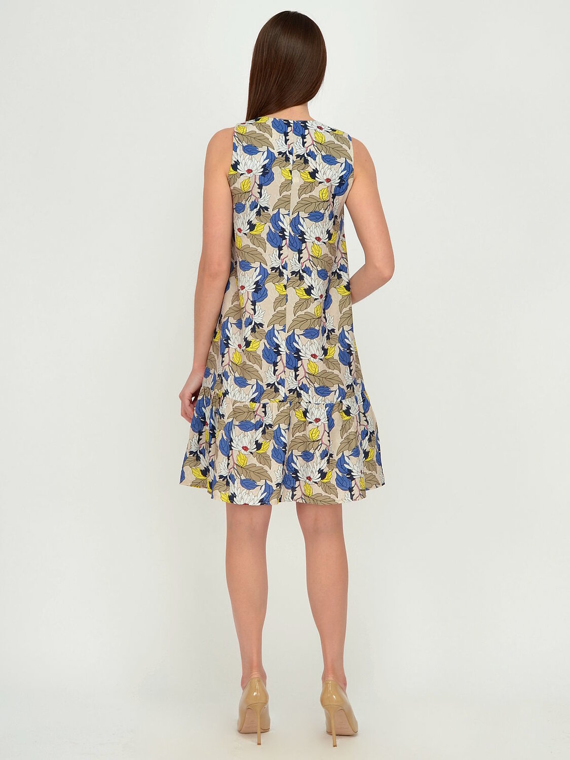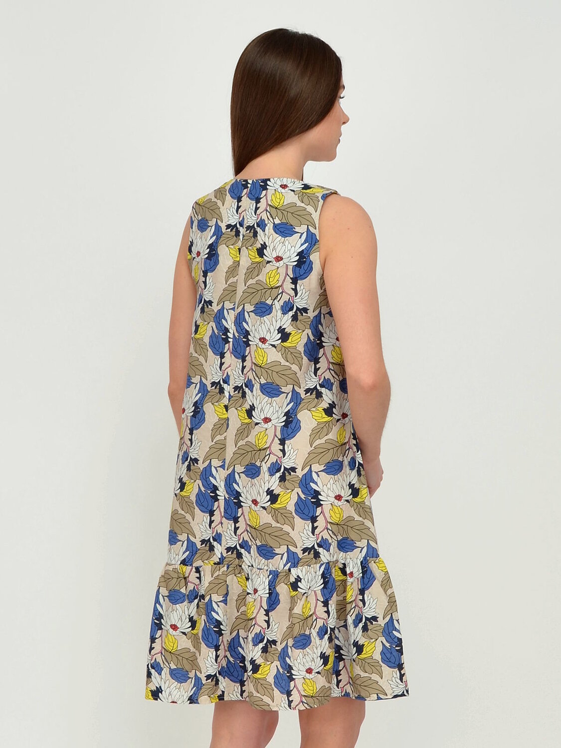 Платье женское без рукавов свободного силуэта.В низу по бокам вшиты воланы. Пряжки регулируют ширину лямок.