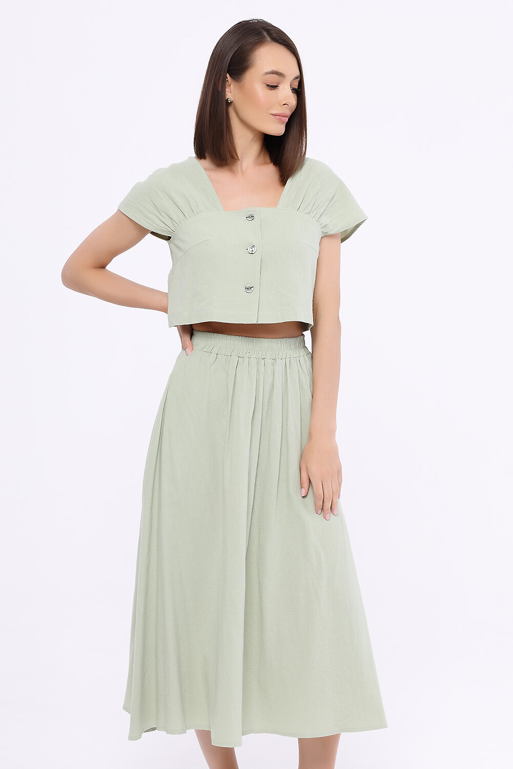 Комплект выполнен из хлопка, дышащего материала, который подарит Вам комфорт в жаркое время года. Комплект из укороченного топа и юбки миди поможет создать стильный повседневный или романтичный образ. Обувь на низком ходу и рюкзак дополнят городской образ для прогулки. А если Вы наденете открытую обувь на каблуке и возьмёте аккуратную сумочку через плечо, получится свежий женственный образ для свидания.