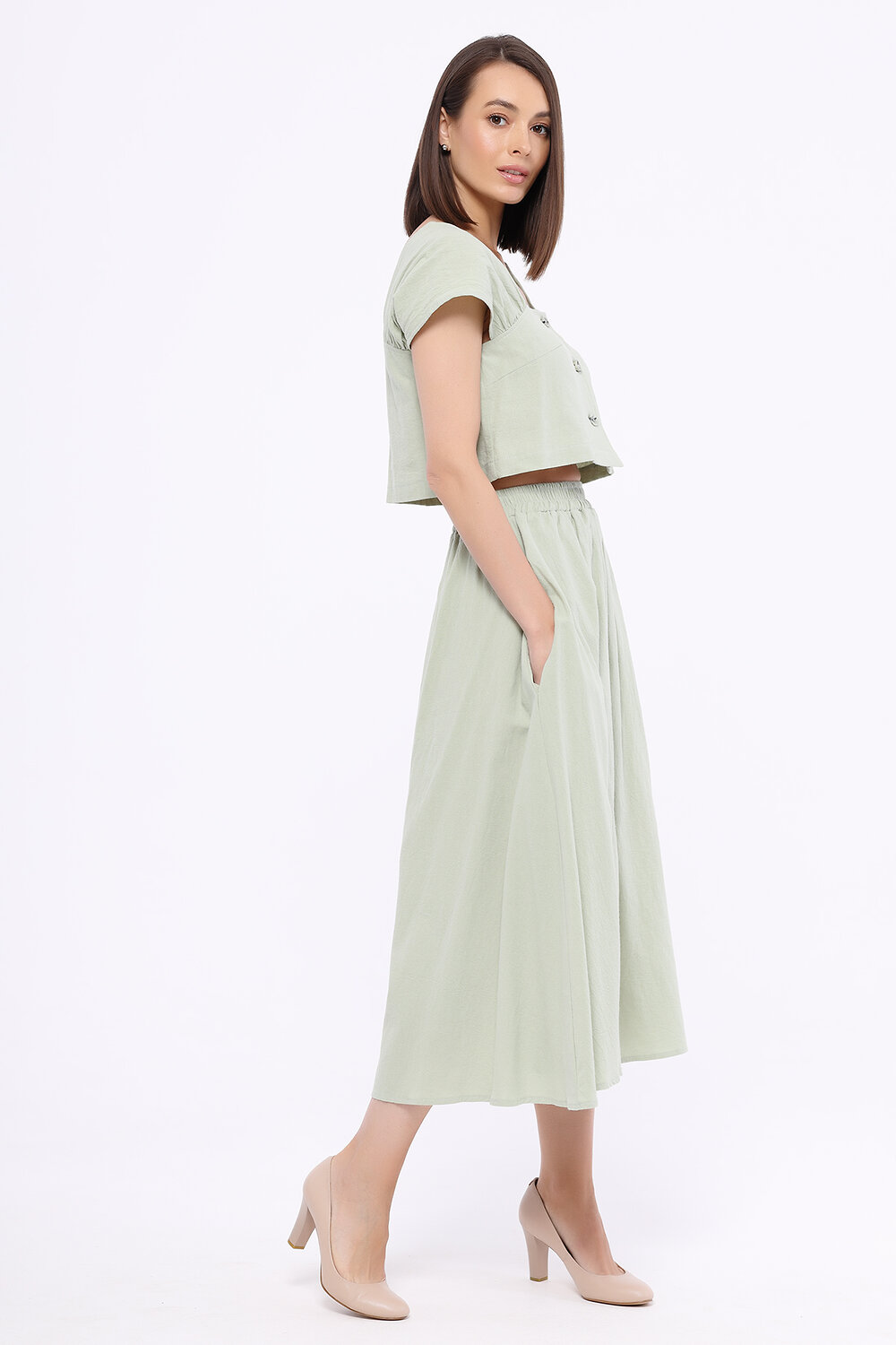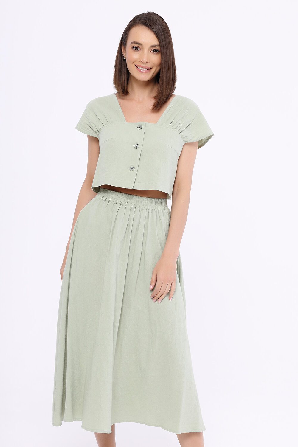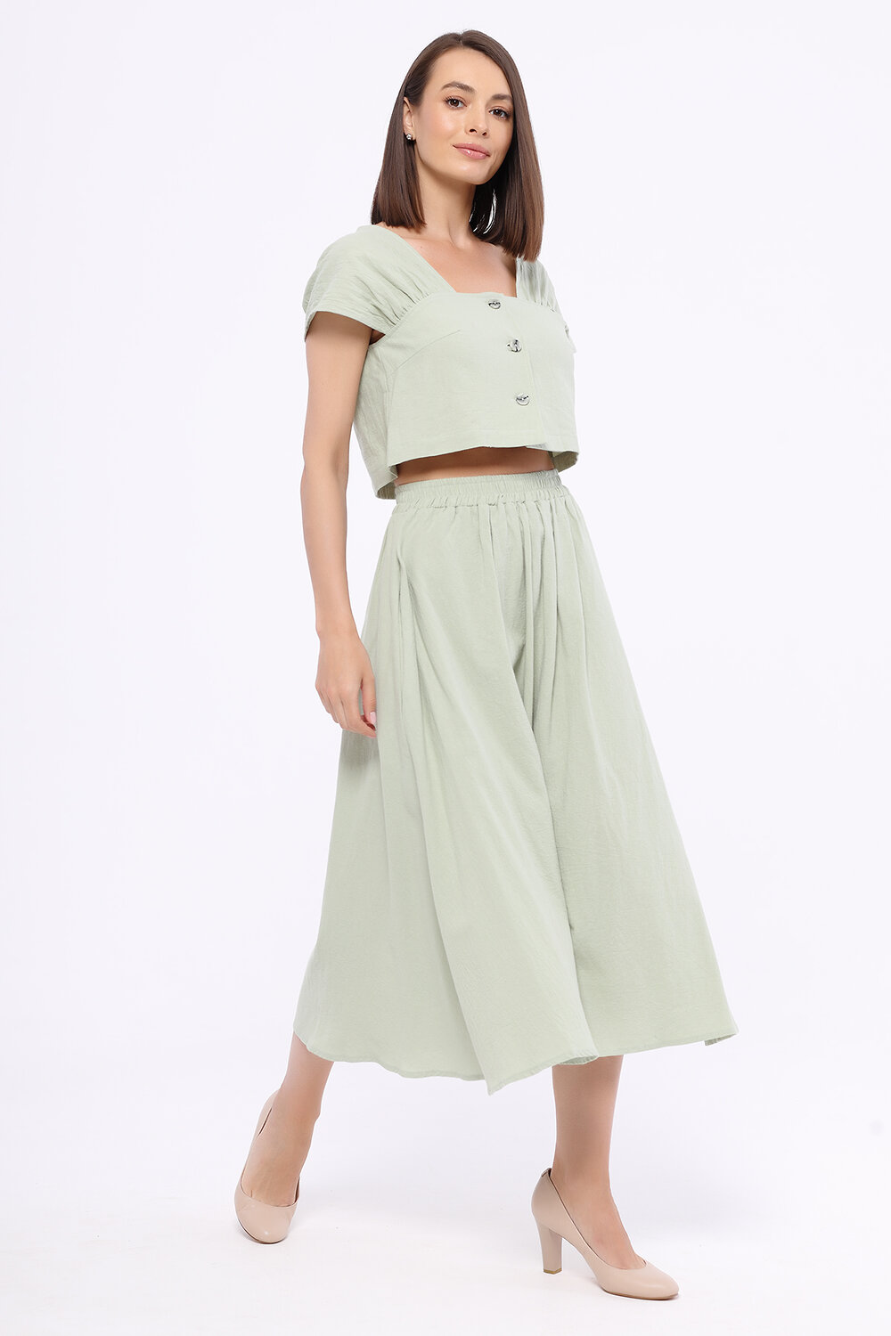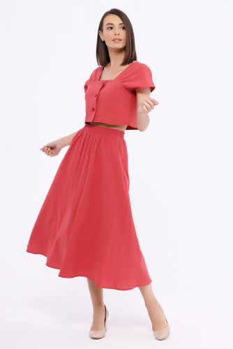 Романтичный летний комплект из топа и юбки миди обязательно найдёт место в летнем гардеробе современной девушки. Укороченный топ подчеркивает линию талии. У топа интересный фигурный вырез спереди и сзади, а также короткие свободные рукава. В широкой юбке миди с завышенной талией и карманами Вы будете чувствовать себя легко и женственно.