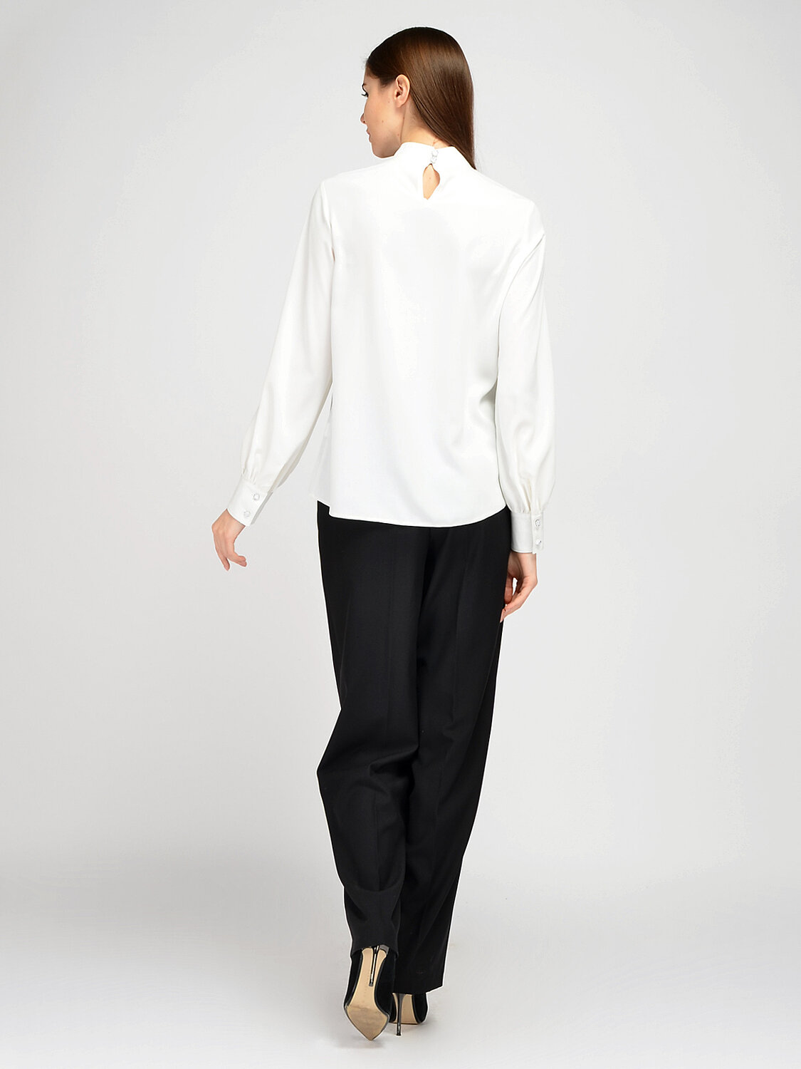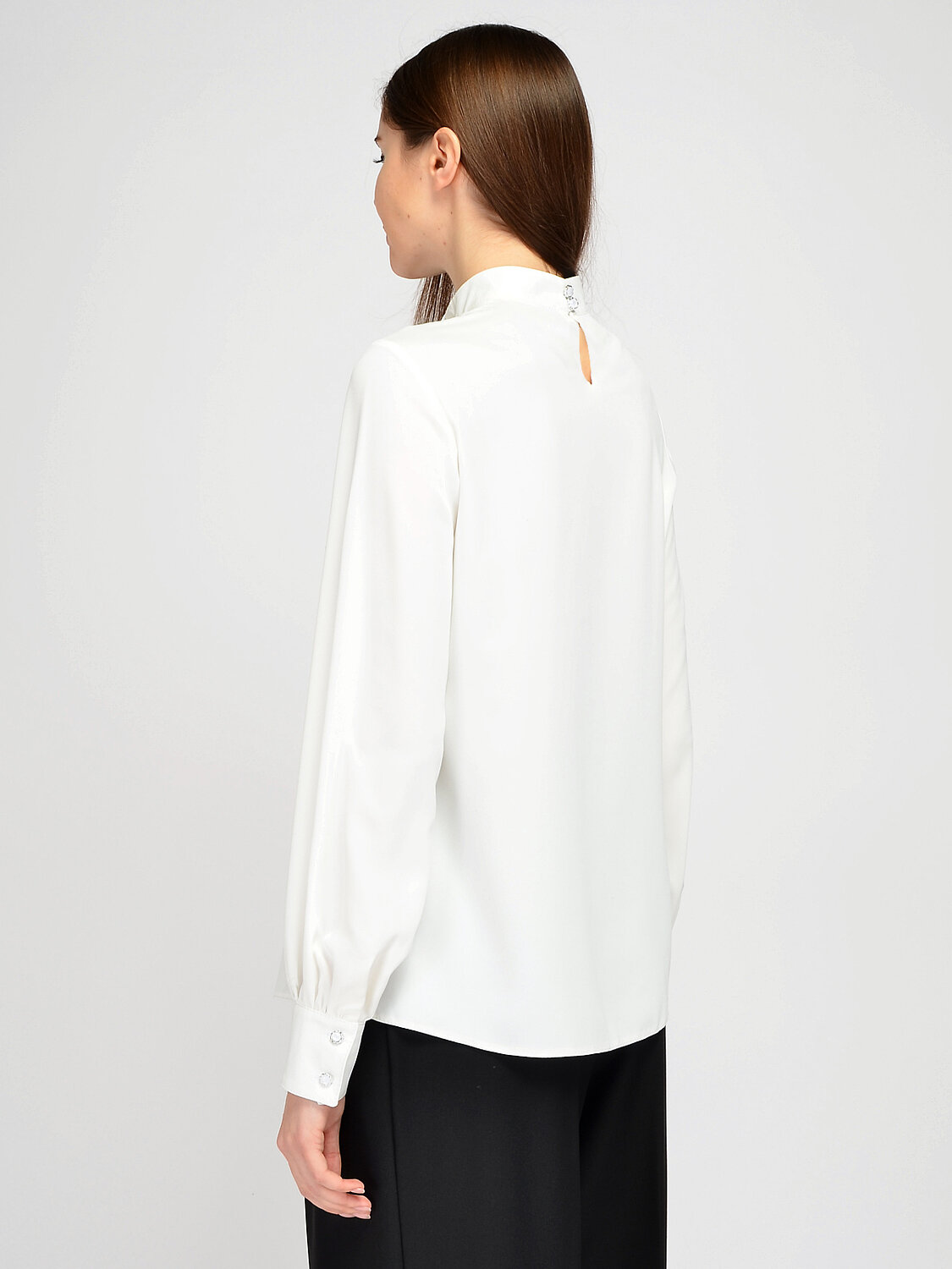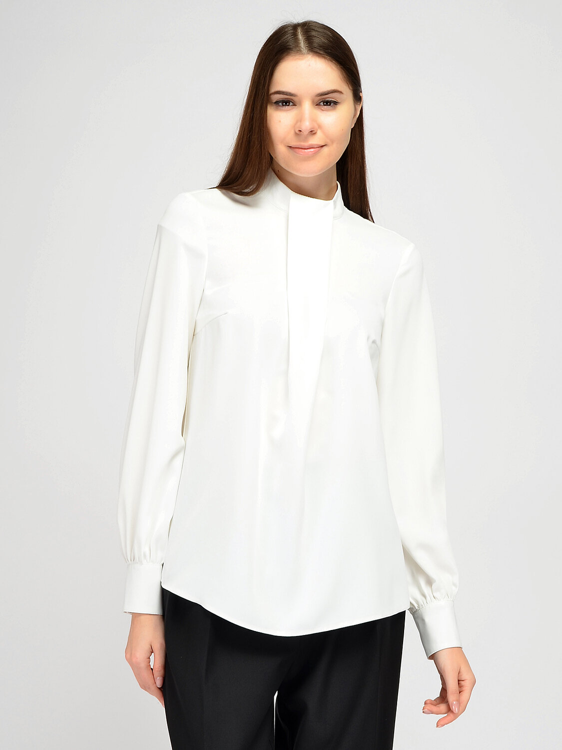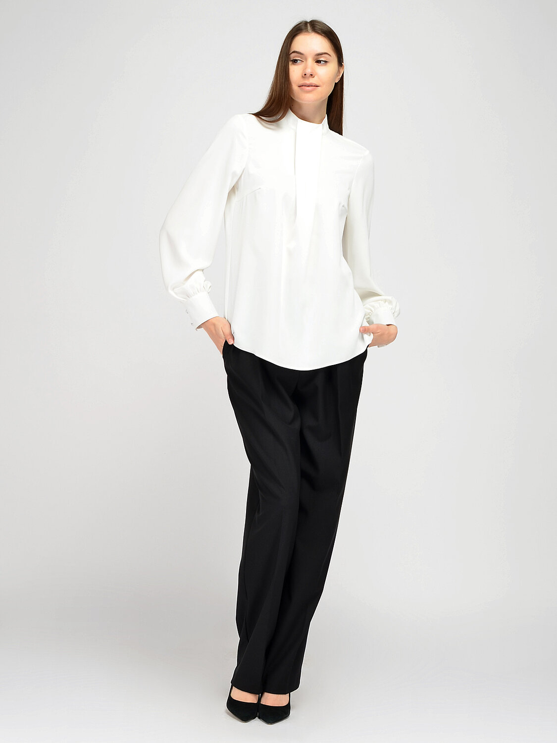 Легкая блузка прямого силуэта станет неотъемлемой частью Вашего стиля. У блузки длинные рукава на манжете, застегиваются на пуговицы. Объемные рукава имеют форму фонарик и собираются пышными складками у запястья. Горловина свободной блузки оформлена стильным воротником-стойкой, от которого расходятся декоративные вертикальные складки, которые визуально вытягивают силуэт. На спинке нарядная блузка имеет изящный вырез капелька и застегивается на 2 жемчужные пуговицы. На груди у блузки располагаются вытачки, а это значит, что блузка отлично сядет на любую фигуру и подчеркнет ее достоинства. Сочетайте блузку оверсайз с классическими брюками или юбками облегающего или прямого кроя. Носите прямую блузку навыпуск или заправленной за пояс, чтобы подчеркнуть линию талии.
