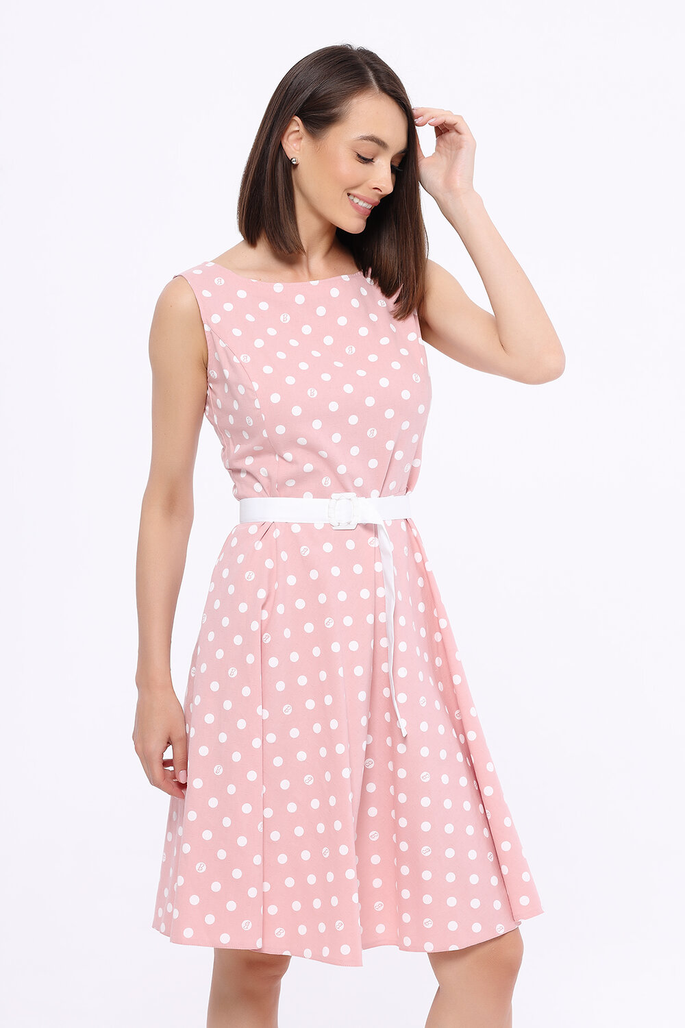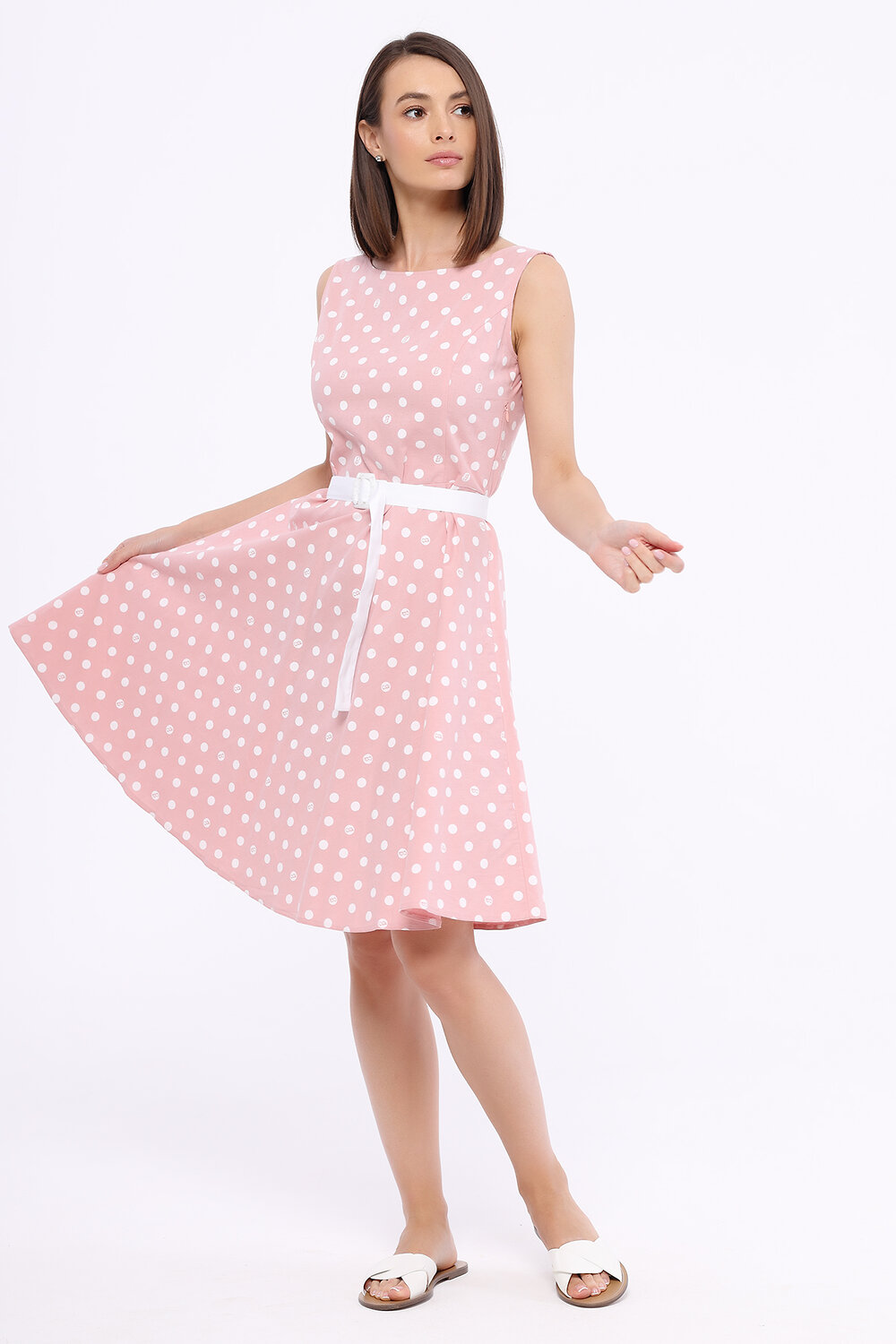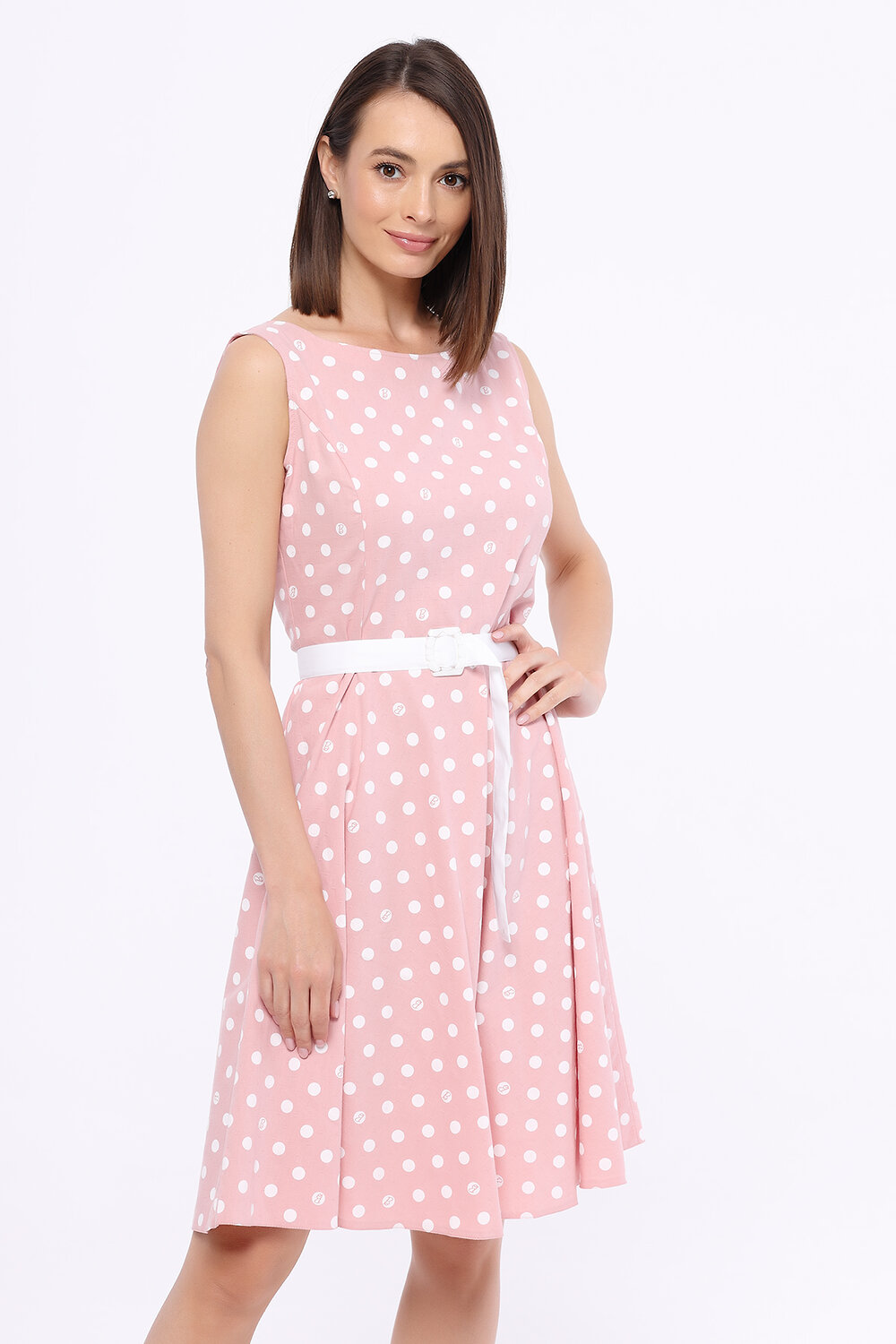 Платье женское без рукавов, отрезное по линии талии , клешеное.На спинке V-образный вырез Дополнено ремнем из ткани.