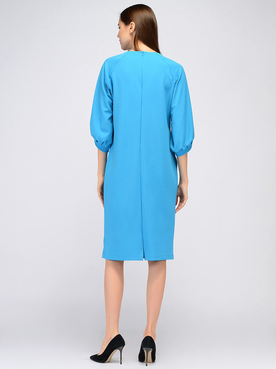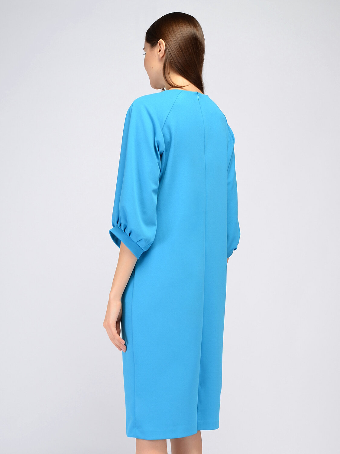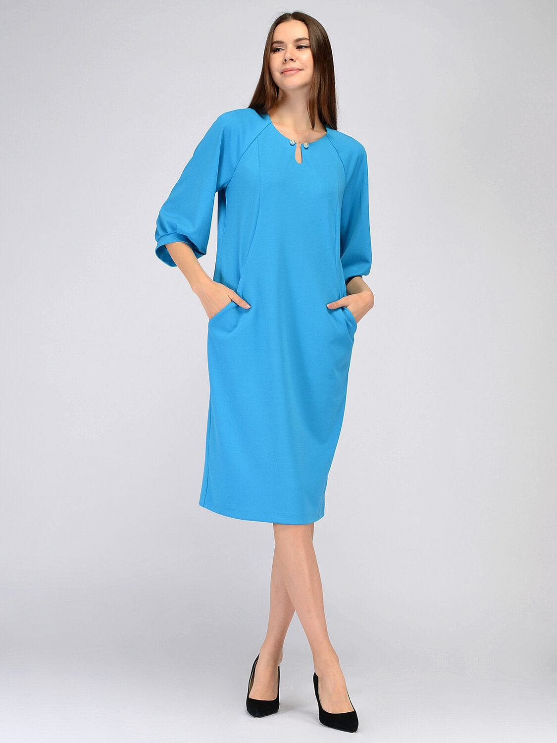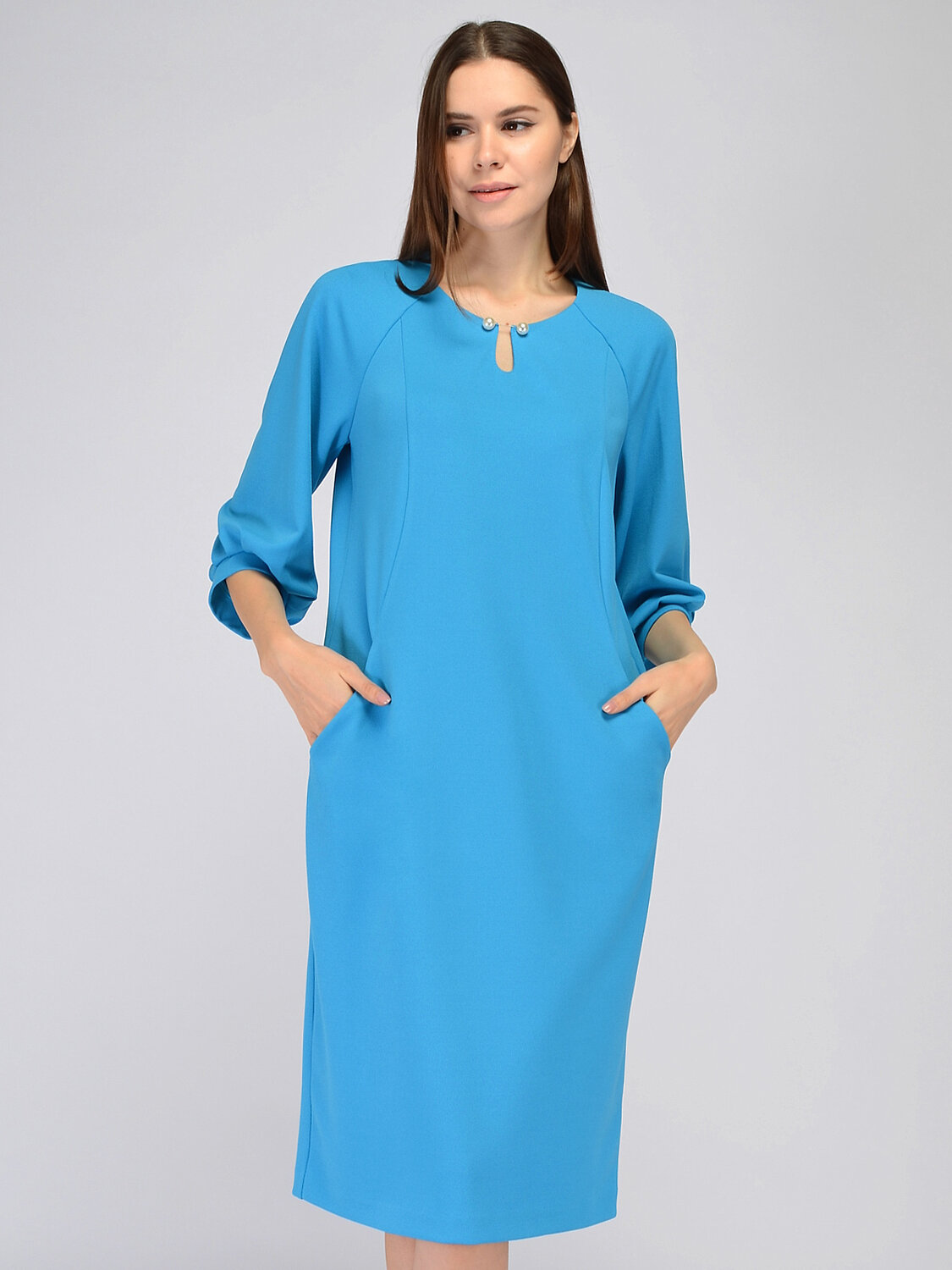 Платье миди с брошью. Изящное платье миди прямого кроя прекрасно подойдёт для делового или торжественного образа. Элегантный округлый вырез горловины дополнен аккуратной брошью и подчеркивает шею и ключицу. Широкие рукава три четверти элегантно приоткрывают руки и придают свободы движениям. Вертикальные вытачки визуально сужают силуэт. Вырез горловины круглый. Без отделки горловины. Длина рукава до локтя. Рукав три четверти. Тип рукава реглан. Комплектация булавка. Вид застежки молния. Декоративный элемент брошь. Длина миди. Крой прямой. Конструктивный элемент с разрезом. Без подкладки. Карманы в шве. Рекомендована стирка при температуре не более 30С.Чтобы завершить образ для офиса, сочетайте платье миди с жакетом, строгой обувью и лаконичными украшениями, а для завершения образа на выход наденьте обувь на каблуке и возьмите аккуратную сумочку. В любом образе Вы будете выглядеть стильно и гармонично.