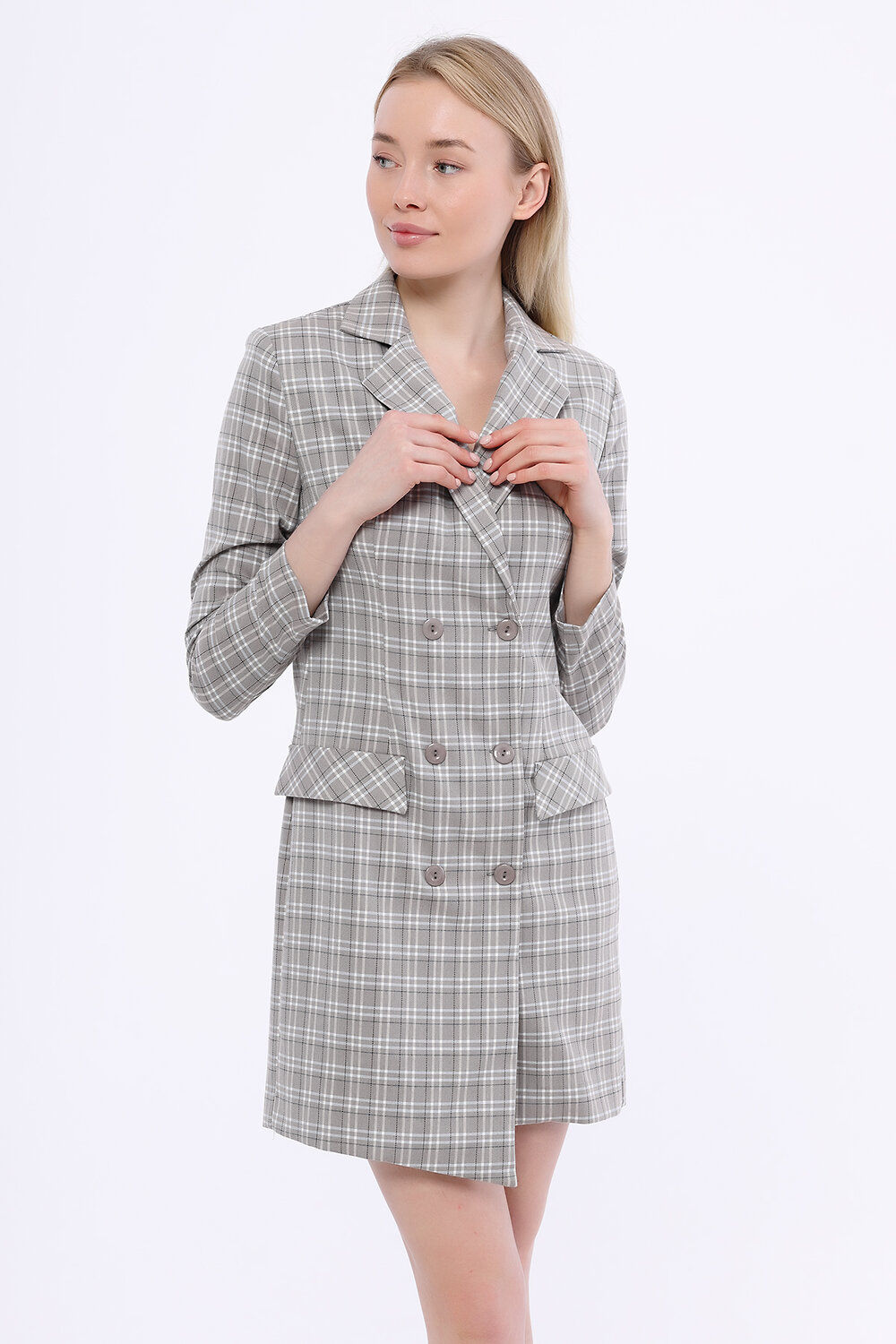 Платье-пиджак с длинным рукавом будет прекрасно смотреться как в офисе, так и на торжественном мероприятии. Отложной воротник и V-образный вырез подчёркивают красоту ключицы. Сдержанное и лаконичное платье мини акцентирует внимание на ногах и визуально удлиняет их. В платье с ассиметричным низом Вы будете выглядеть строго и эффектно в любой обстановке.