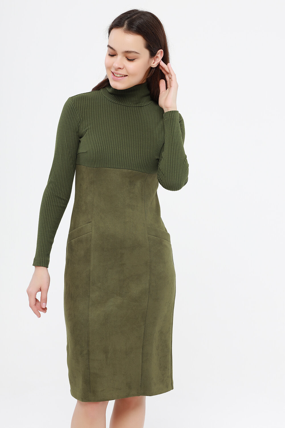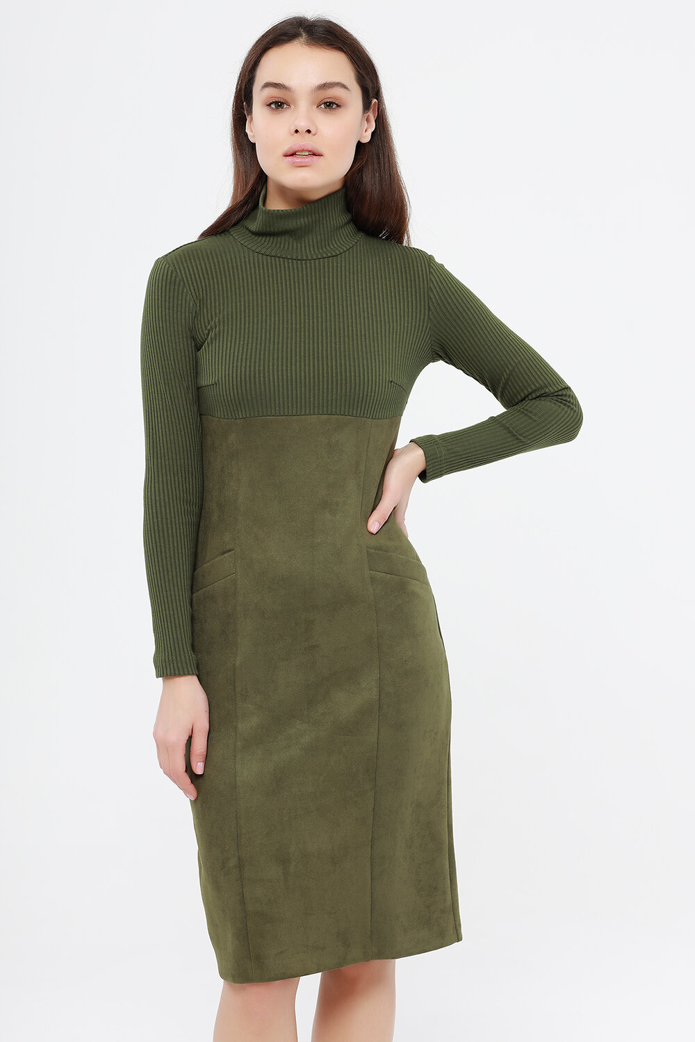 Платье женское, комбинированное. Рукав длинный. Воротник-стойка. На полочке карманы с листочкой .
