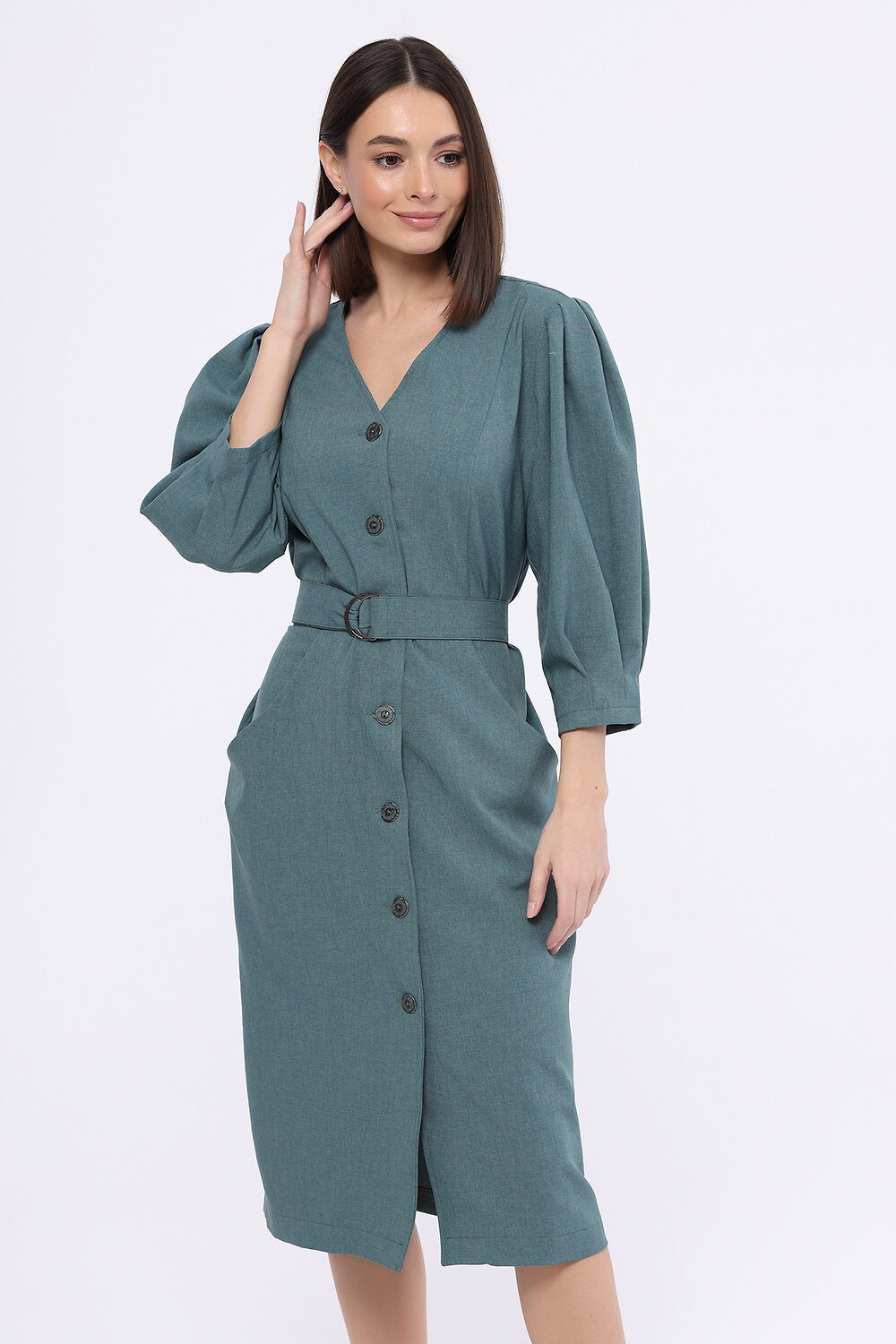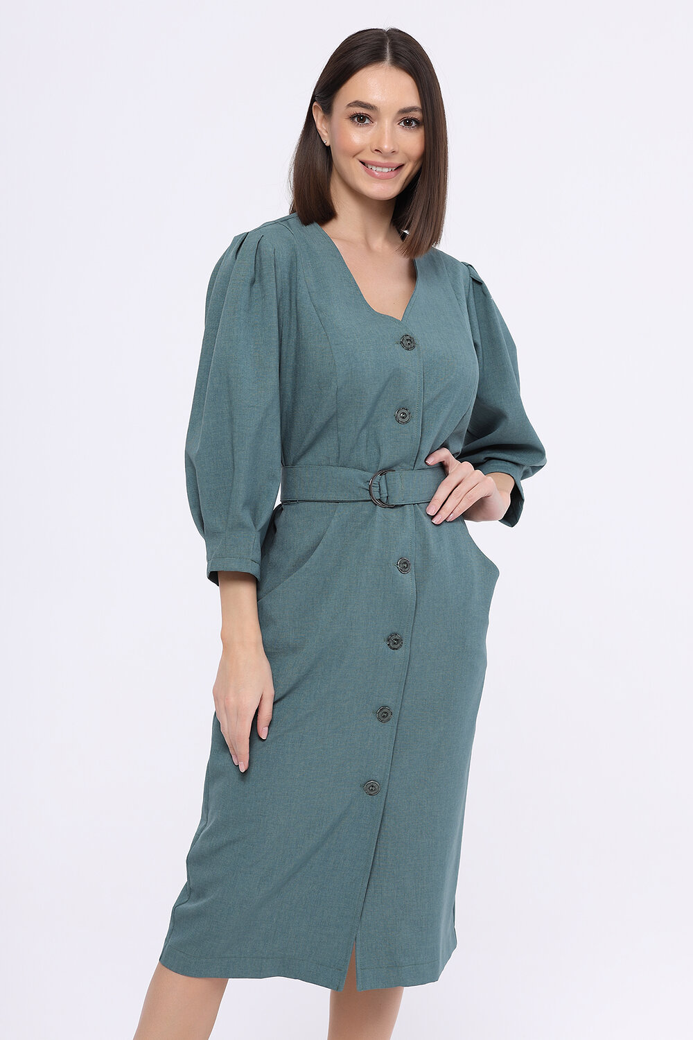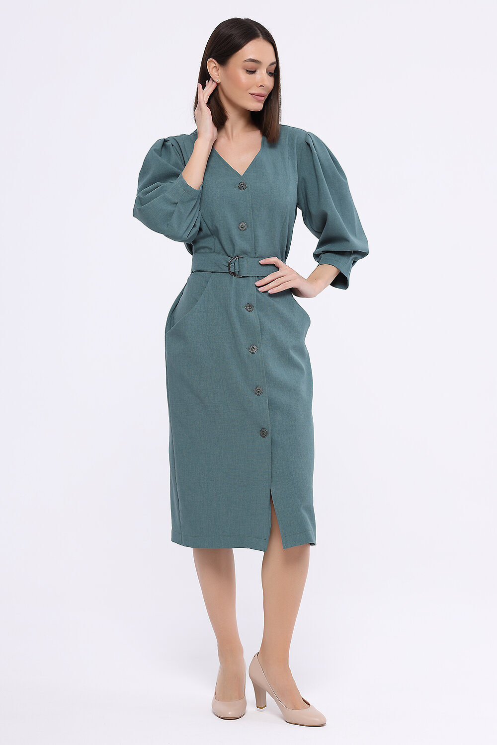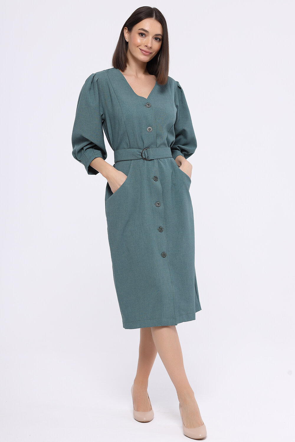 В составе платья полиэстер 50%, вискоза 50%. V-образный вырез. Вид застёжки - пуговицы. Пояс в комплекте. Рукав укороченный, до локтя. Декоративные складки на рукавах. Наклонные карманы в боковых швах. Длина миди. Модель юбки - зауженная. Крой приталенный. Рекомендована стирка при температуре не более 30С.