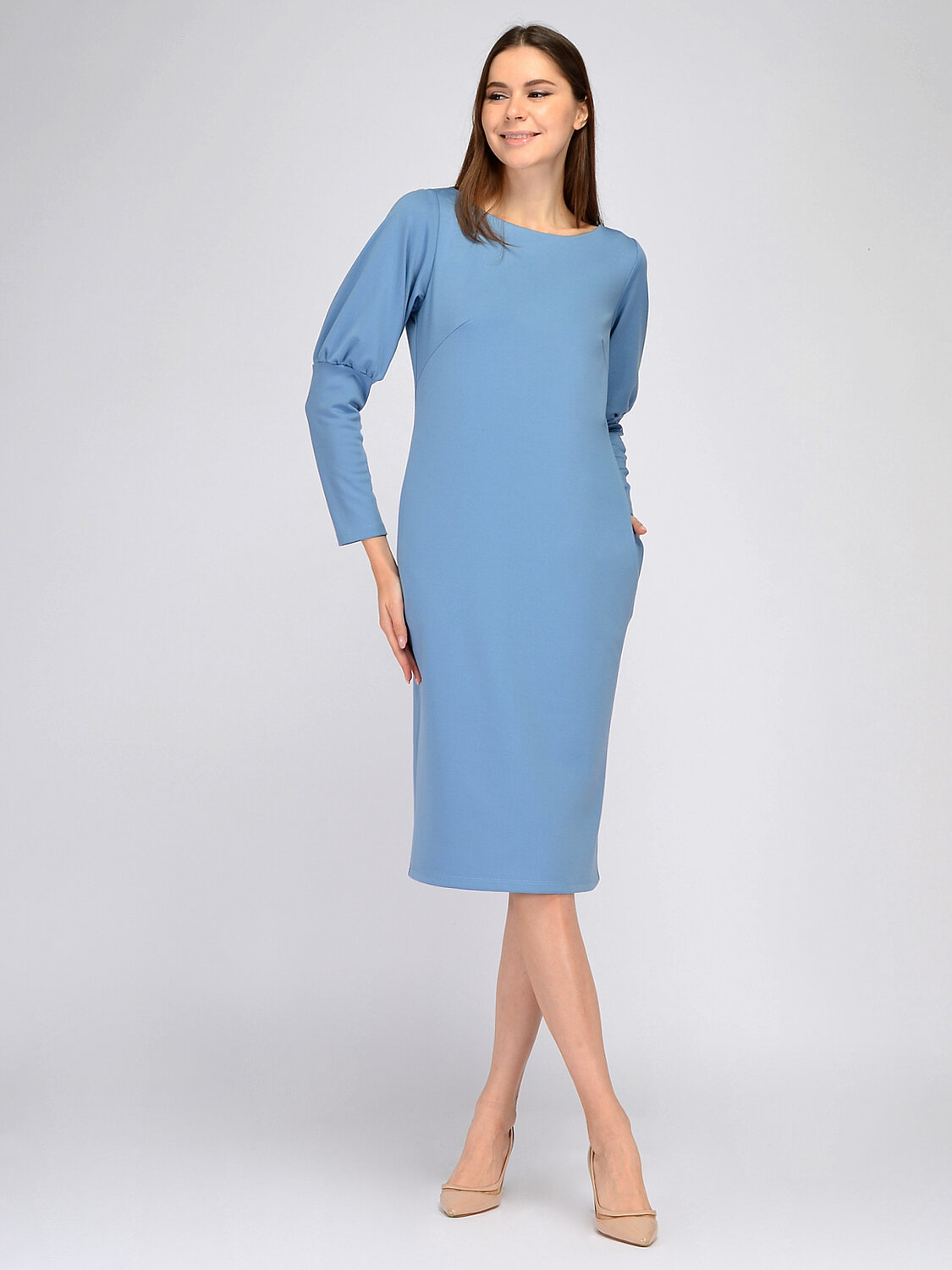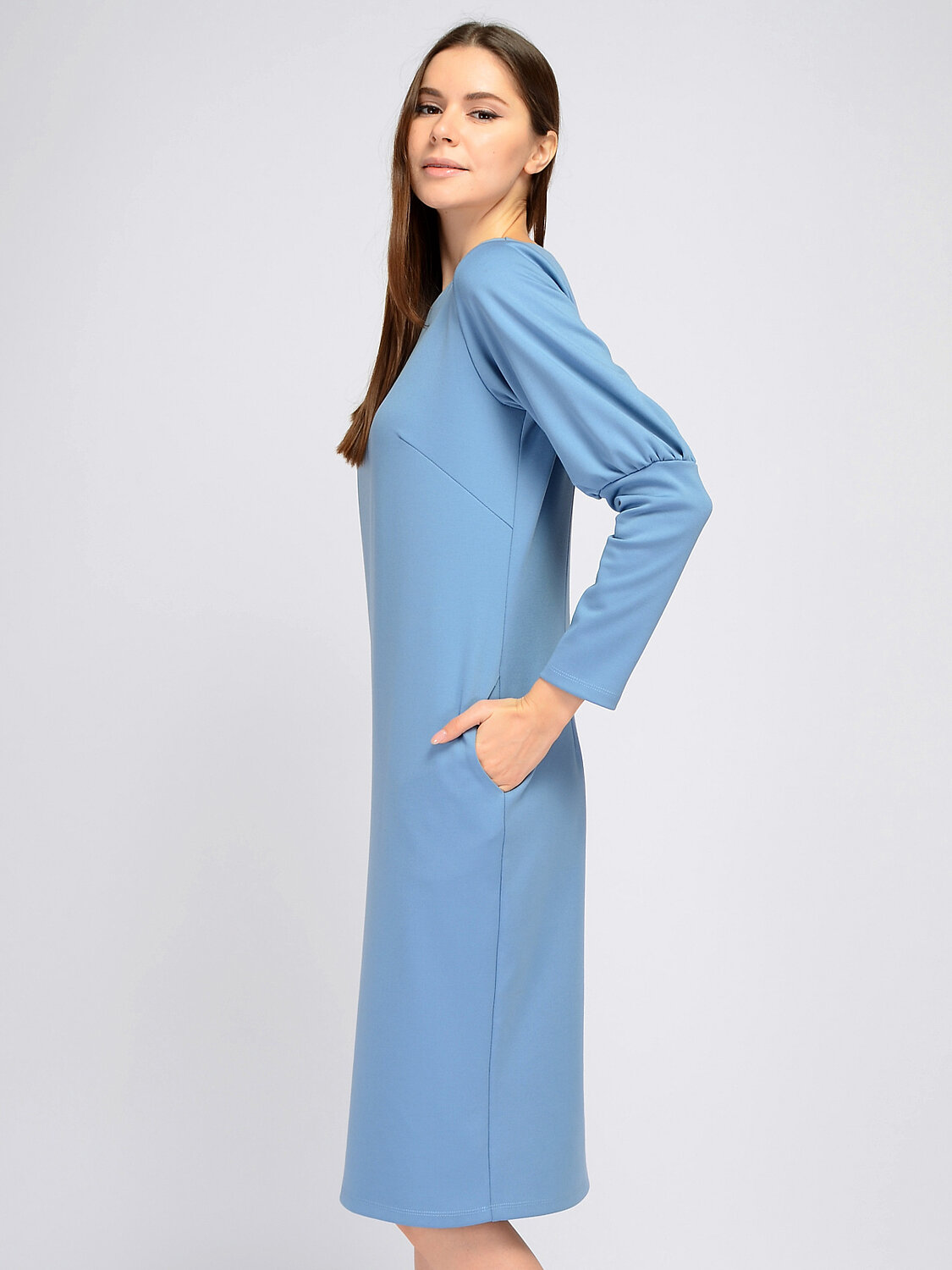 Платье миди с длинным рукавом.В гардеробе каждой девушки должно найтись место для универсального платья миди с длинным рукавом. Изящная округлая горловина придает образу элегантности, приоткрывая ключицу. Прямой крой платья и длина миди идеально подойдут любому типу фигуры. Рукава до локтя имеют свободную форму, а после локтя продолжаются аккуратным манжетом.Вырез горловины круглый. Без отделки горловины. Рукава длинные. Рукава втачные. Форма рукава узкие. Без застежки. Длина миди. Конструктивный элемент карман. Карманы в шве. Крой приталенный. Ручная стирка при t не более 30С.Спокойное и изящное платье миди станет частью Вашего офисного или торжественного стиля. Дополните образ украшениями, обувью на высоком или на низком ходу и подходящей сумочкой.