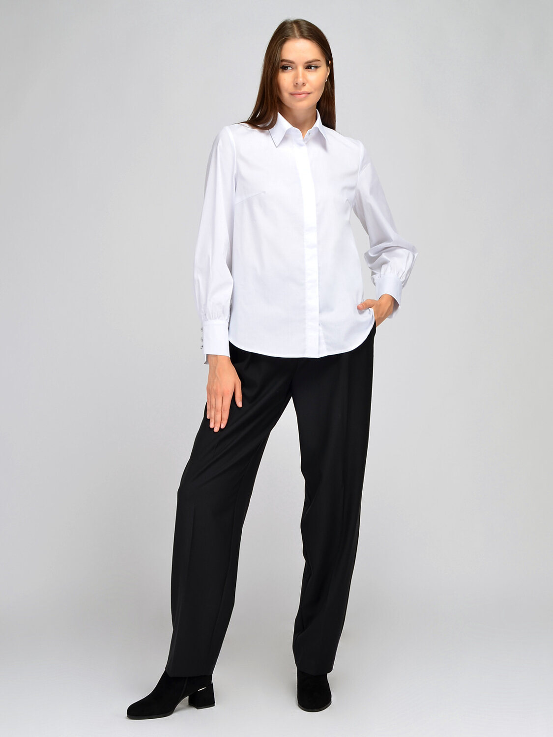 Базовая рубашка с оригинальными деталями придется по вкусу модницам любого возраста. Блузка имеет классический отложной воротник, застегивается на пуговицы, которые скрыты вертикальной планкой, чтобы ничто не отвлекало от Вашего образа. Прямой крой с вытачками на груди позволяет вещи идеально сесть на любую фигуру, даже если у Вас большой размер одежды. У блузы модные объемные рукава с интересными манжетами, на которых расположены по три изящных пуговицы. Сам манжет асимметричный, что придает изделию эффектный акцент. Рубашка выполнена из качественной хлопковой ткани, обеспечивая Вам комфорт на протяжении всего дня. Вы можете надеть универсальную блузу на работу, в офис, в школу, а также на торжественные мероприятия, театр или вечеринку. Изделие имеет фигурные вырезы по бокам, полочка и спинка имеют закругленную форму. Вы можете носить вещь как навыпуск, так и заправлять ее за пояс. Вы можете заправить блузу только спереди или со всех сторон. Лаконичная рубашка оверсайз сочетается как со строгими брюками, юбками и жакетами, так и с более повседневными вариантами, например, джинсами. Создайте свои неповторимы образы, взяв за основу базовую блузку оверсайз!
