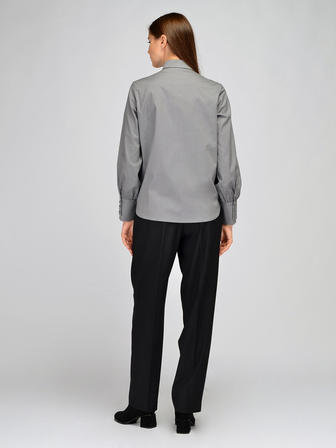 Базовая рубашка с оригинальными деталями придется по вкусу модницам любого возраста. Блузка имеет классический отложной воротник, застегивается на пуговицы, которые скрыты вертикальной планкой, чтобы ничто не отвлекало от Вашего образа. Прямой крой с вытачками на груди позволяет вещи идеально сесть на любую фигуру, даже если у Вас большой размер одежды. У блузы модные объемные рукава с интересными манжетами, на которых расположены по три изящных пуговицы. Сам манжет асимметричный, что придает изделию эффектный акцент. Рубашка выполнена из качественной хлопковой ткани, обеспечивая Вам комфорт на протяжении всего дня. Вы можете надеть универсальную блузу на работу, в офис, в школу, а также на торжественные мероприятия, театр или вечеринку. Изделие имеет фигурные вырезы по бокам, полочка и спинка имеют закругленную форму. Вы можете носить вещь как навыпуск, так и заправлять ее за пояс. Вы можете заправить блузу только спереди или со всех сторон. Лаконичная рубашка оверсайз сочетается как со строгими брюками, юбками и жакетами, так и с более повседневными вариантами, например, джинсами. Создайте свои неповторимы образы, взяв за основу базовую блузку оверсайз!