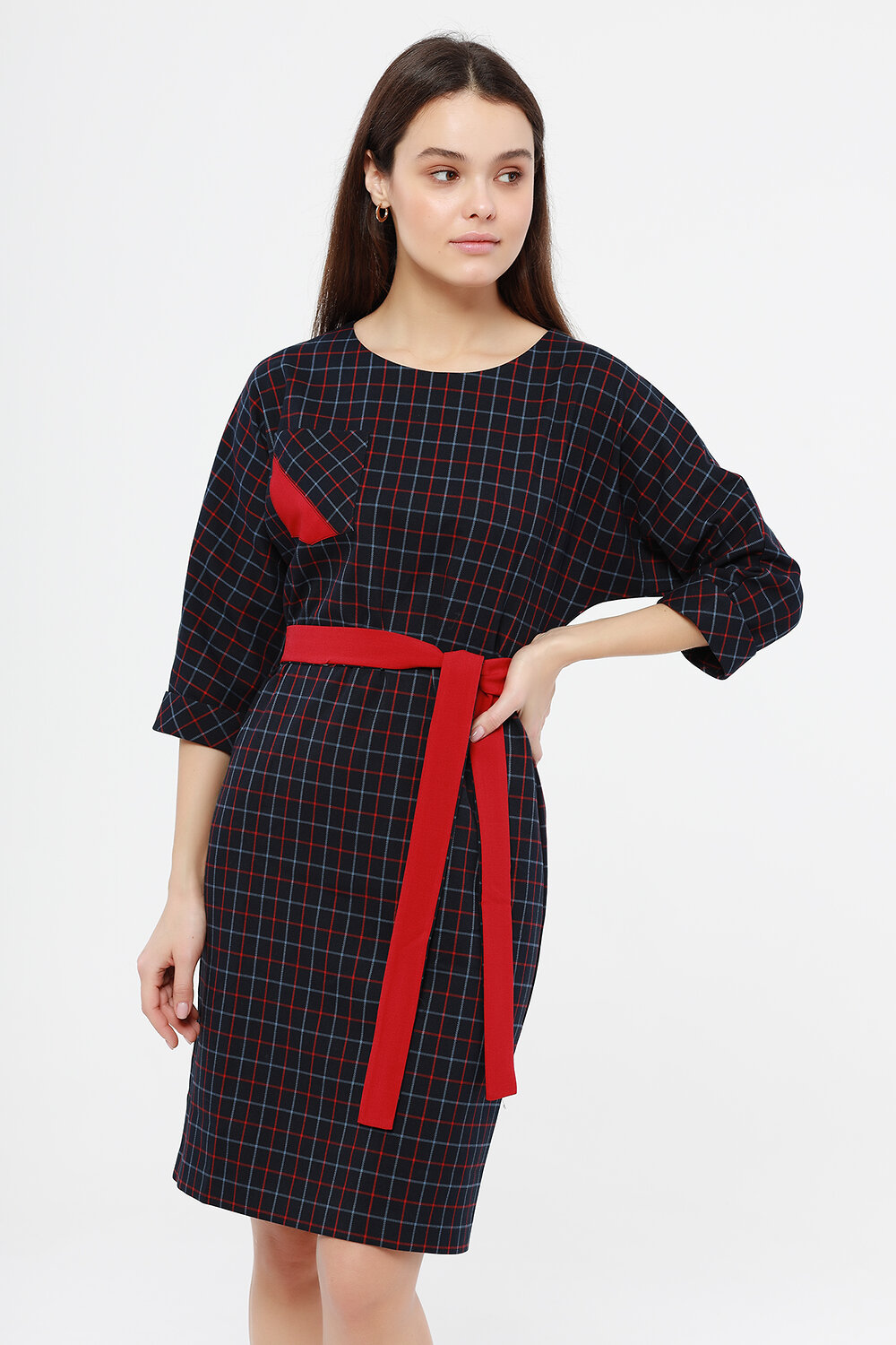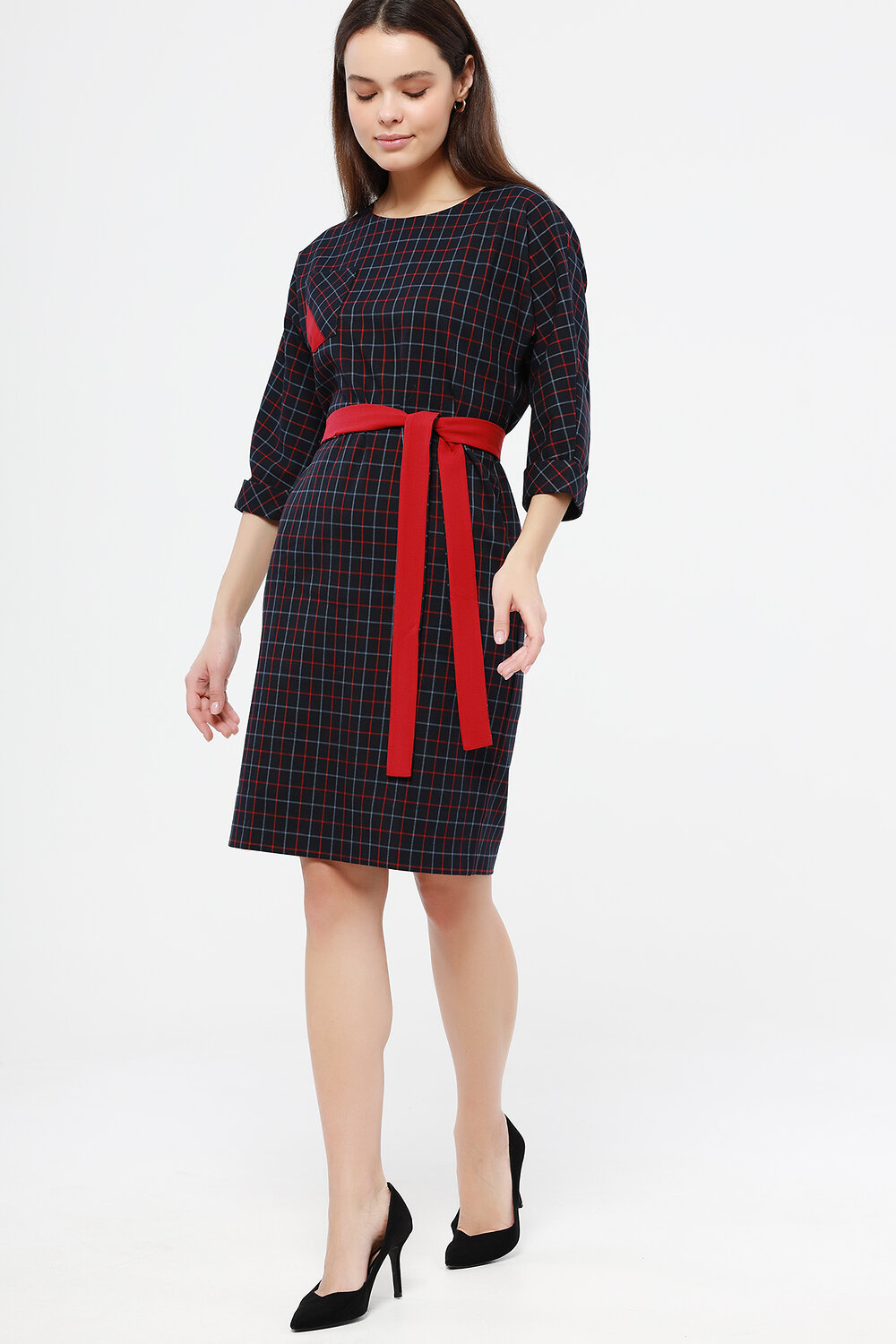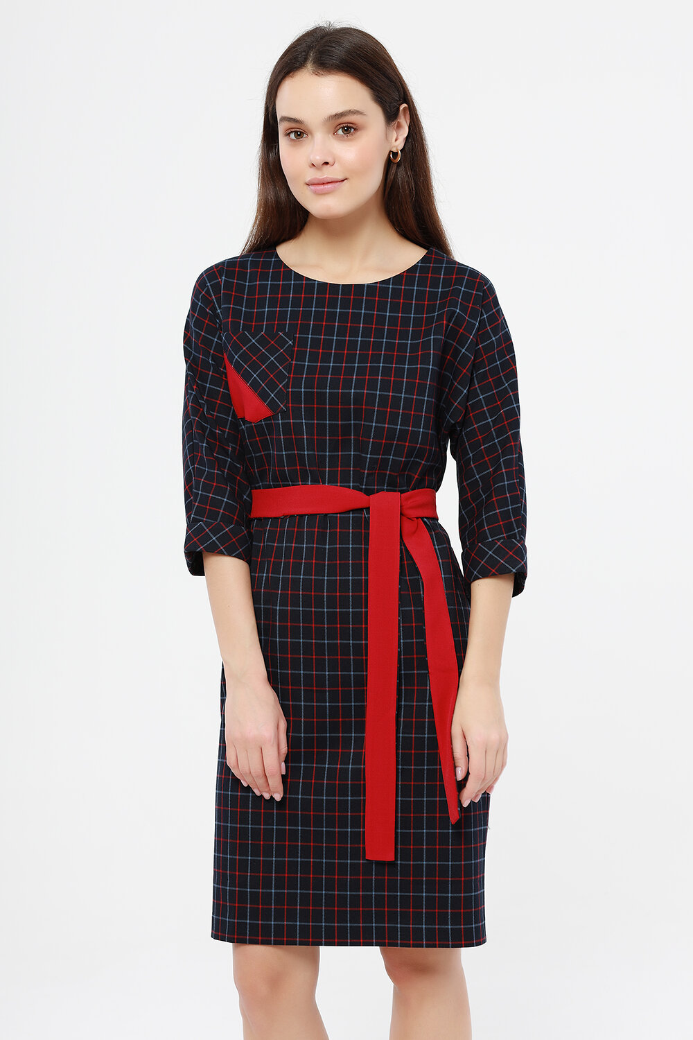 Платье женское прямого силуэта. рукав цельнокроеный три четверти. На передней полочке накладной карман. Изделие дополнено двусторонним поясом.