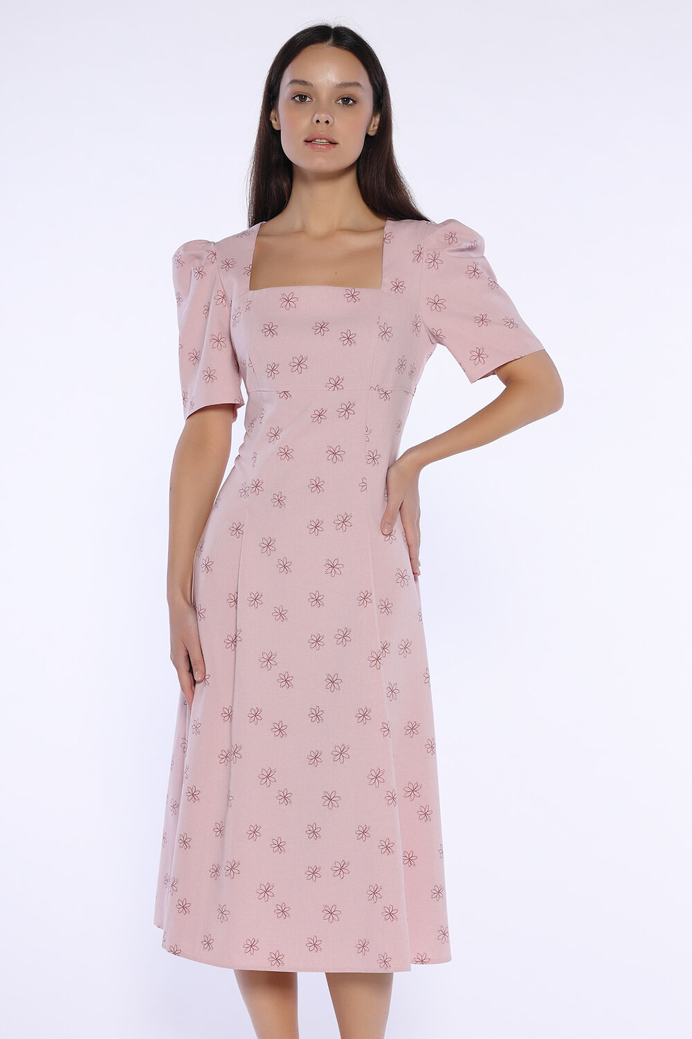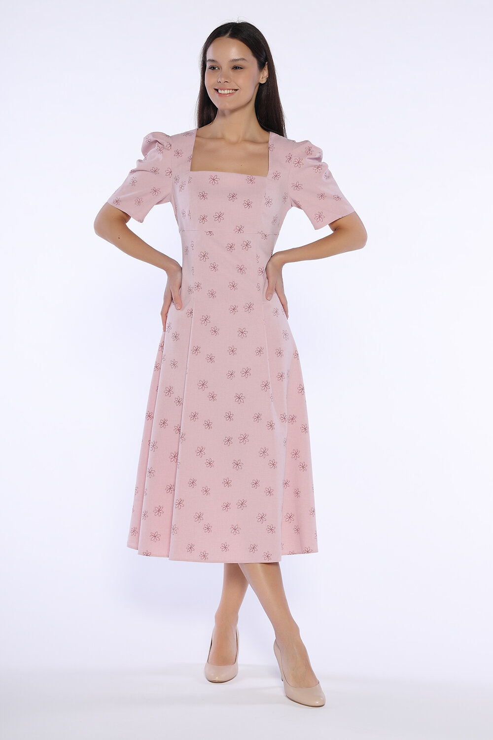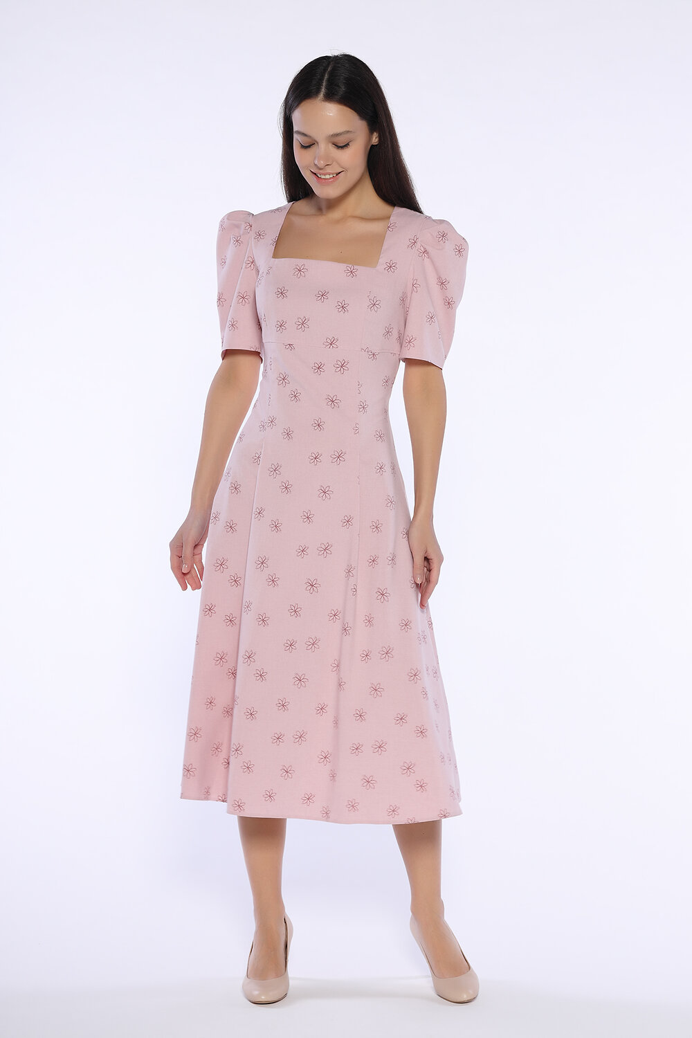 Летнее платье миди приталенного силуэта станет важной новинкой Вашего гардероба. Миди платье с расклешенной юбкой обеспечит Вам элегантный и женственный образ на каждый день или для особых случаев. Длинное летнее платье имеет стильный квадратный вырез горловины, придавая образу интеллигентности. Под грудью находится декоративная горизонтальная отстрочка, привлекающая внимание к зоне декольте. Чтобы платье миди идеально сидело фигуре, на нем предусмотрены вытачки. Оригинальной деталью платья являются объемные рукава чуть выше локтя. Спереди и сзади на юбке находятся складки, моделирующие силуэт. Свободный крой юбки скроет возможные недостатки фигуры. Лаконичный фасон с эффектными элементами составит строгий и в то же время игривый образ. Вы можете надеть летнее платье ниже колена в офис, на свидание, на торжественное мероприятие, на свадьбу. Универсальное платье придется по вкусу как взрослым женщинам, так и молодым девушкам. Завершите образ украшениями и обувью на каблуке (лодочками или босоножками).