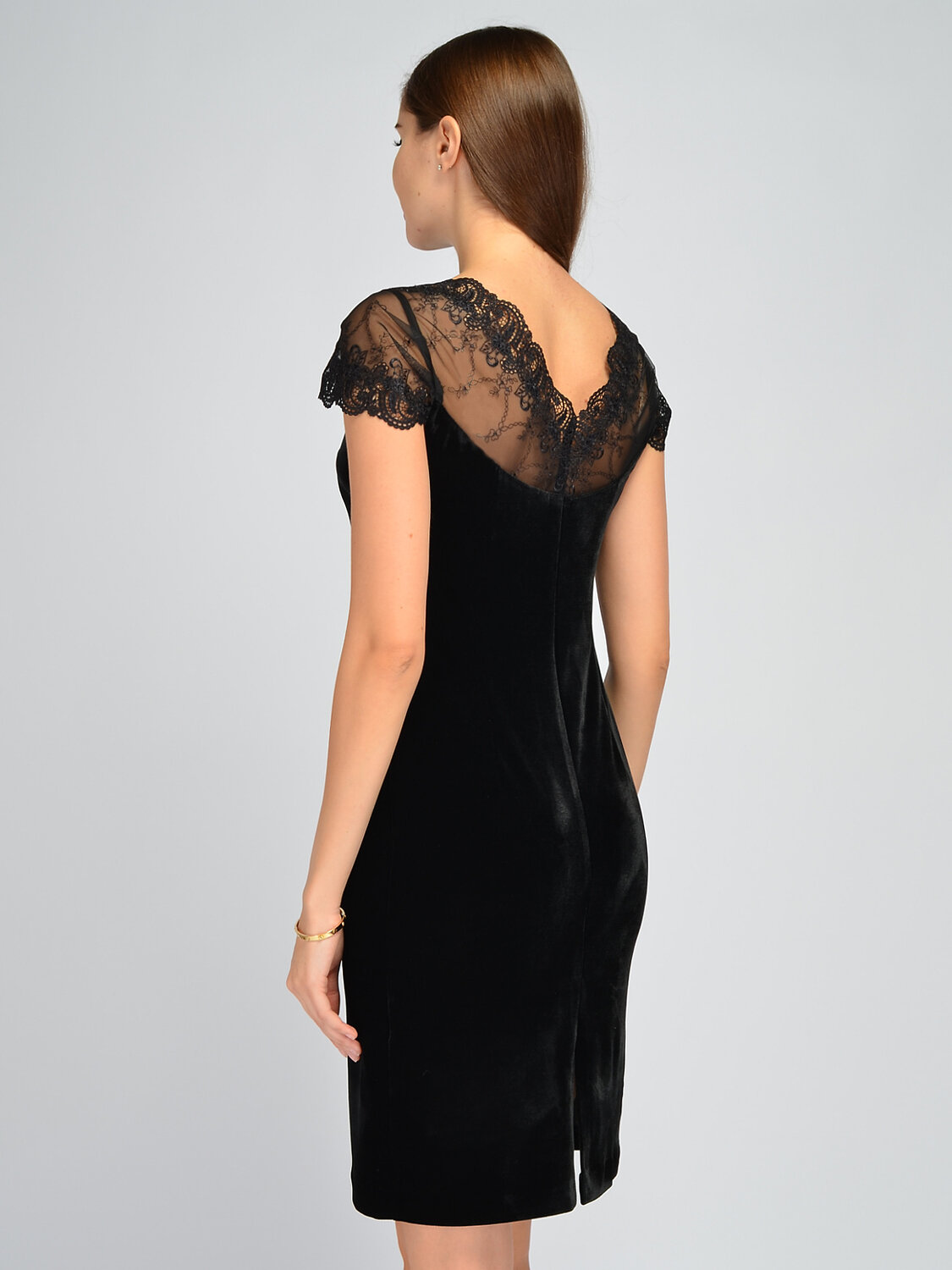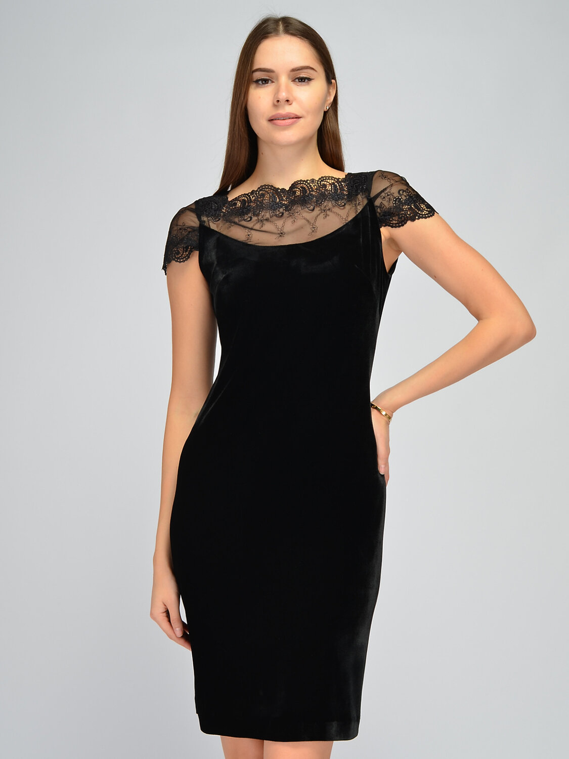 Праздничное платье миди с кружевом станет элегантной новинкой в Вашем гардеробе. Платье выполнено из приятной наощупь бархатистой ткани. Крой платья предусматривает вытачки на груди, чтобы оно прекрасно подошло на любые формы. Приталенный фасон подчеркнет изгибы фигуры, создавая изящный утонченный силуэт. Верхняя часть изделия декорирована прозрачной сеточкой с цветочной вышивкой. Сзади платье имеет V-образный вырез, придавая образу изысканности и романтичности. Для удобства при ходьбе сзади предусмотрен достаточно высокий разрез. Платье до колена гармонично впишется в нарядные образы для различных праздников и торжественных мероприятий. Завершите нежный образ лаконичной обувью на высоком ходу, небольшой сумочкой и контрастными серьгами. Приталенное платье до колена подойдет как взрослым женщинам, так и молодым девушкам, которые выбирают женственный стиль в одежде. Выбирайте бархатное платье с кружевными деталями, если хотите притягивать восхищенные взгляды и получать максимум комплиментов!