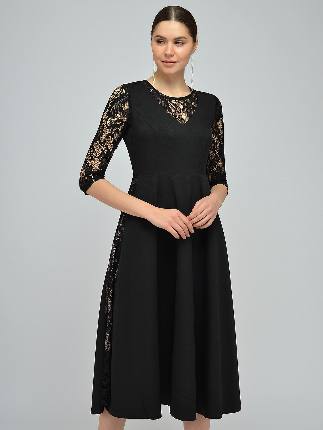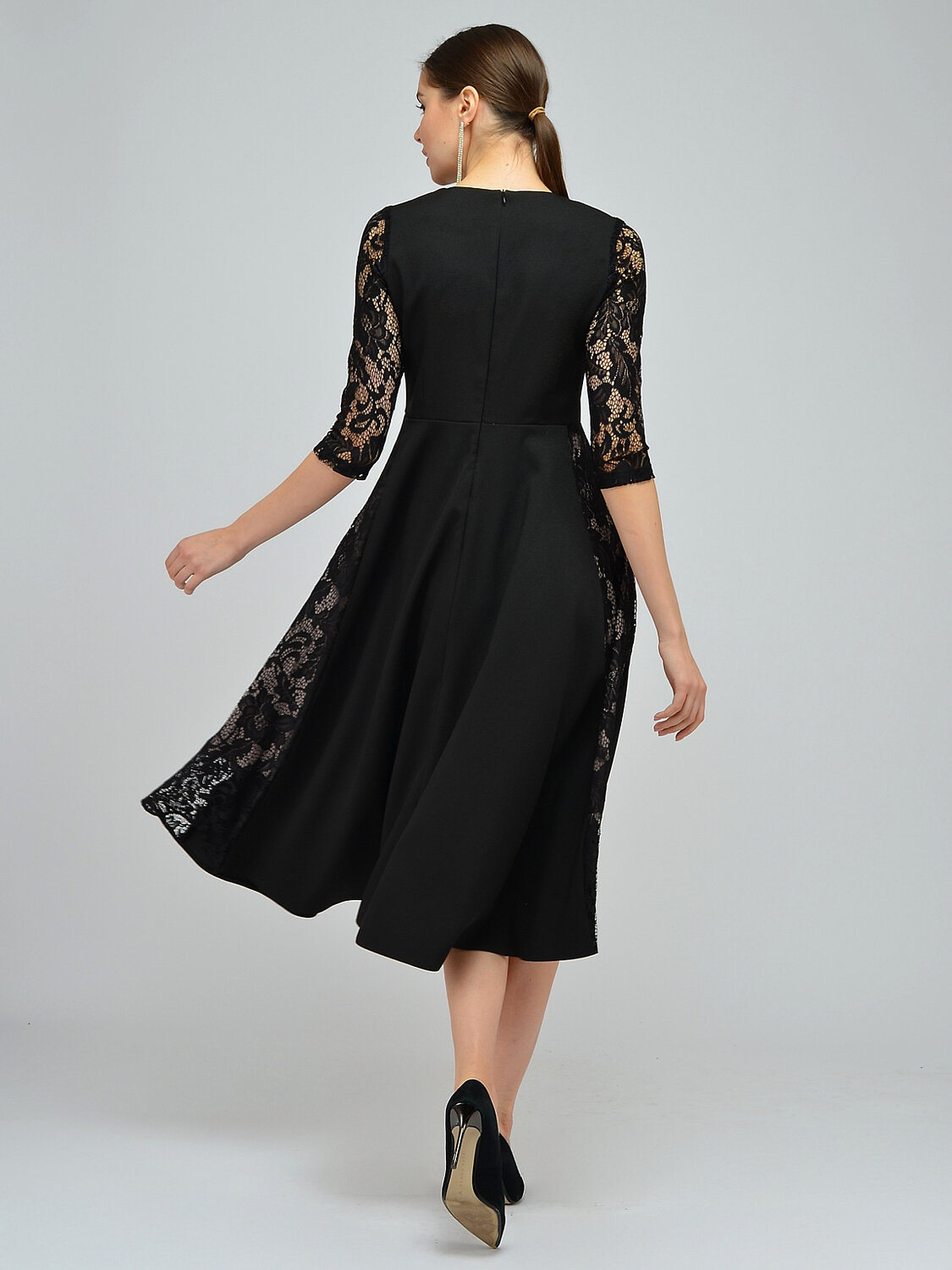 Гармоничное платье приталенного силуэта - прекрасный выбор для праздничного мероприятия. Строгая классика в сочетании с кокетливыми декоративными вставками выглядит романтично и изящно. Полупрозрачная горловина и рукава три четверти смотрятся очень эффектно.