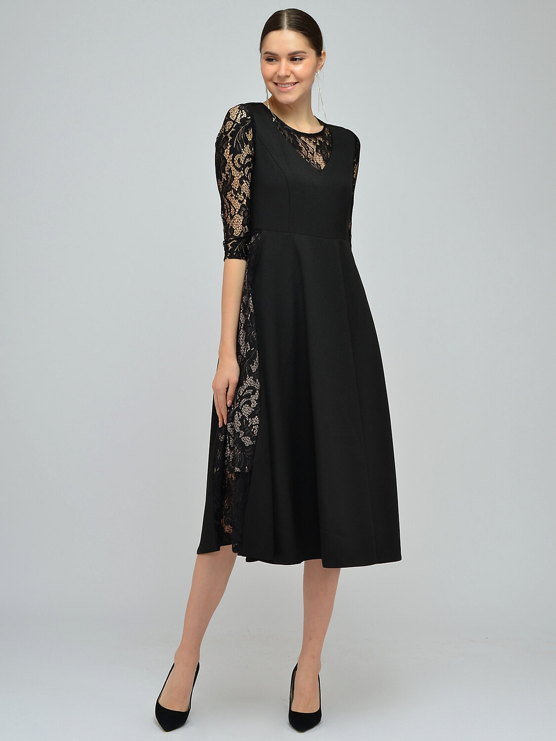 В составе платье полиэстер 95%, лайкра 5%. Платье женское приталенного силуэта. Рукав три четверти из гипюра. На полочке и юбке декоративные вставки из гипюра. Расклешеная юбка на подкладе. Рекомендована бережная стирка при температуре не более 30С.