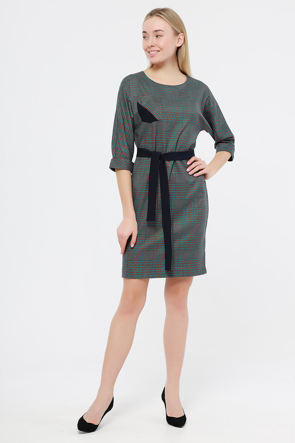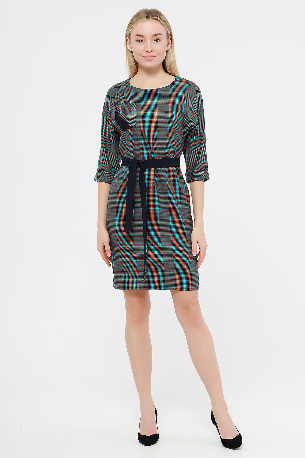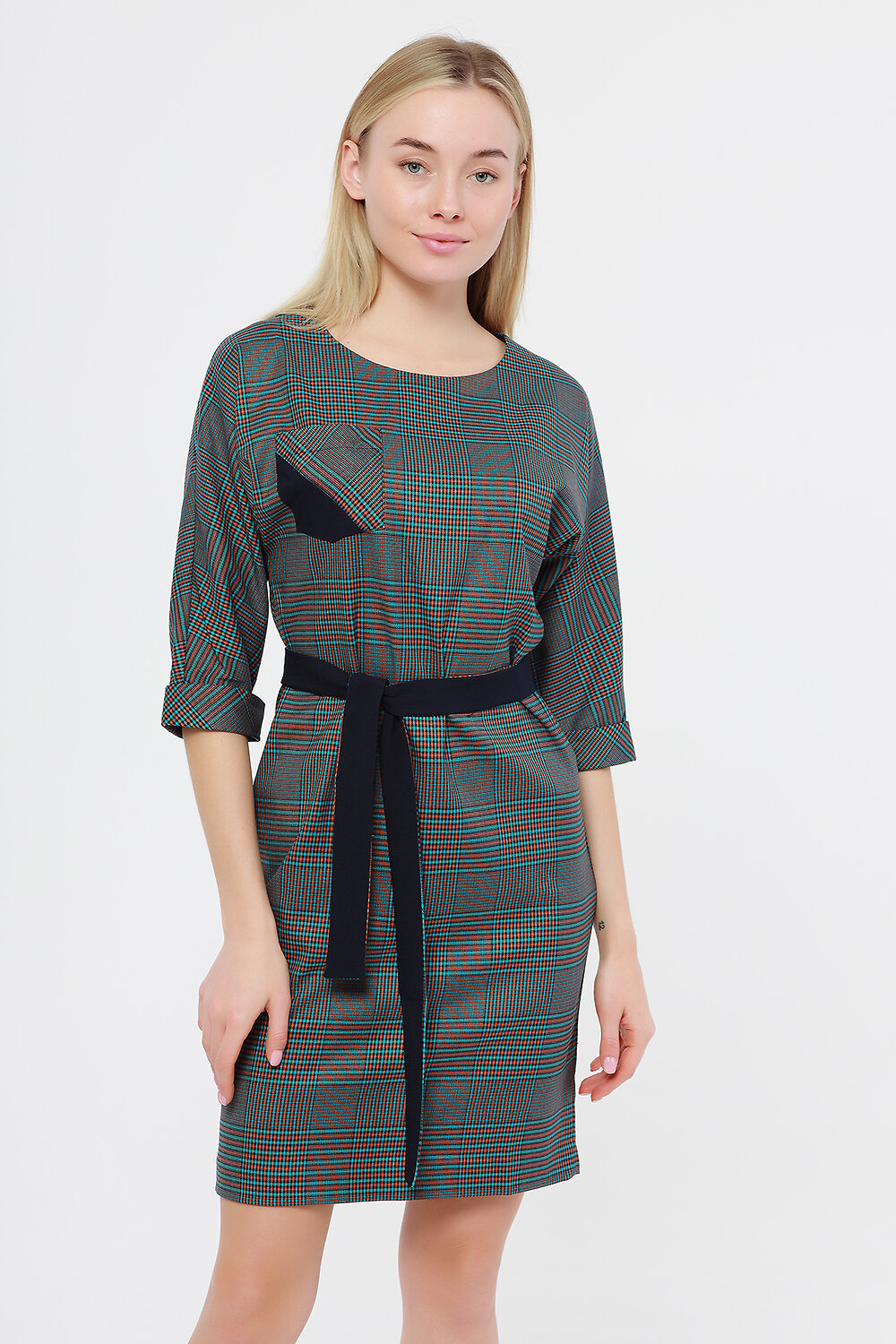 Платье женское прямого силуэта. рукав цельнокроеный три четверти. На передней полочке накладной карман. Изделие дополнено двусторонним поясом.