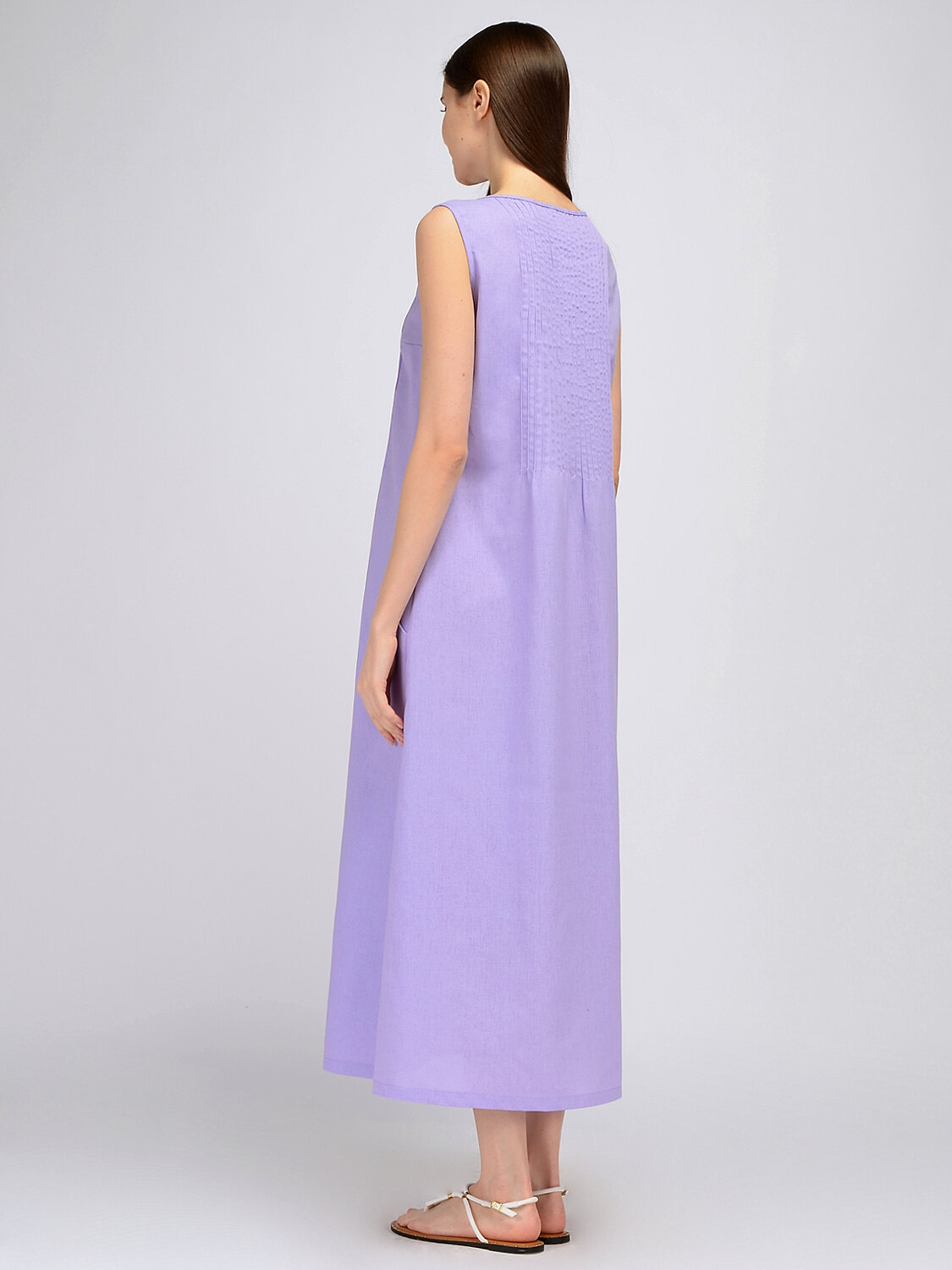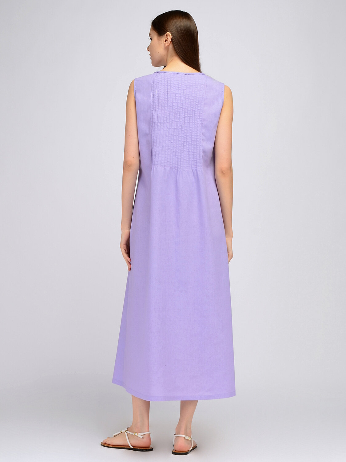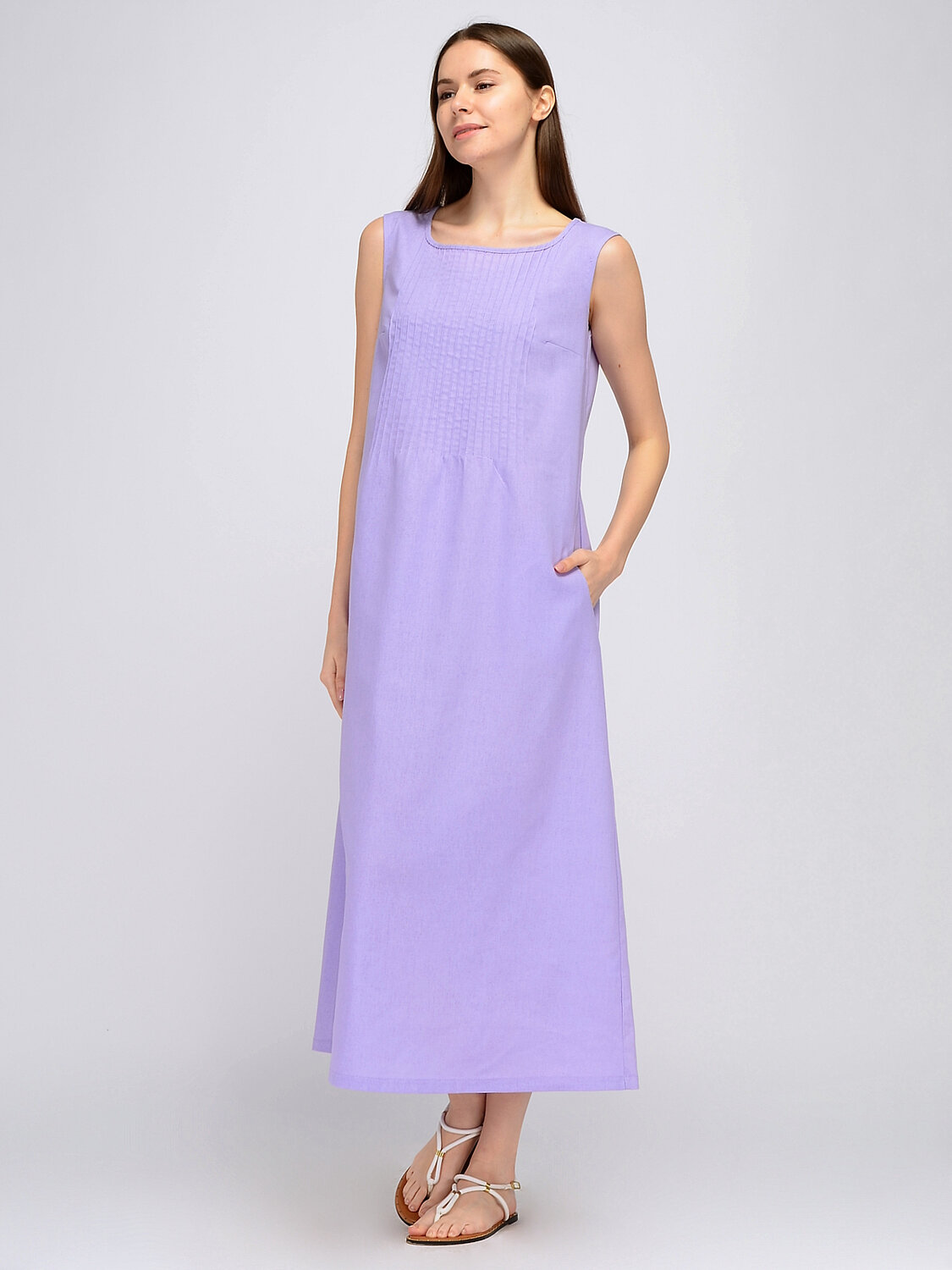 Полуприлегающее платье без рукавов - идеальная летняя модель. В составе платья лён, благодаря которому Вы будете чувствовать себя максимально комфортно в жаркое время года. На спинке и полочке расположены декоративные защипы до линии талии. А для удобства современной девушки на платье предусмотрены карманы в шве Без отделки горловины. Без рукава. Без застёжки. Длина макси. Крой прямой. Карманы в шве. Платье женское полуприлегающего силуэта без рукавов. На спинке и полочке защипы до линии талии. В боковых швах карманы. Рекомендована стирка при температуре не более 30С.