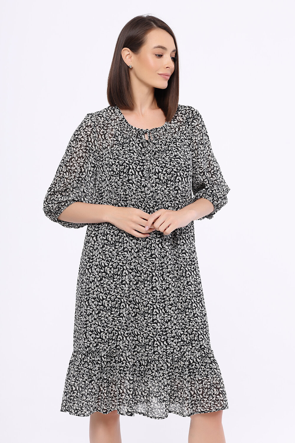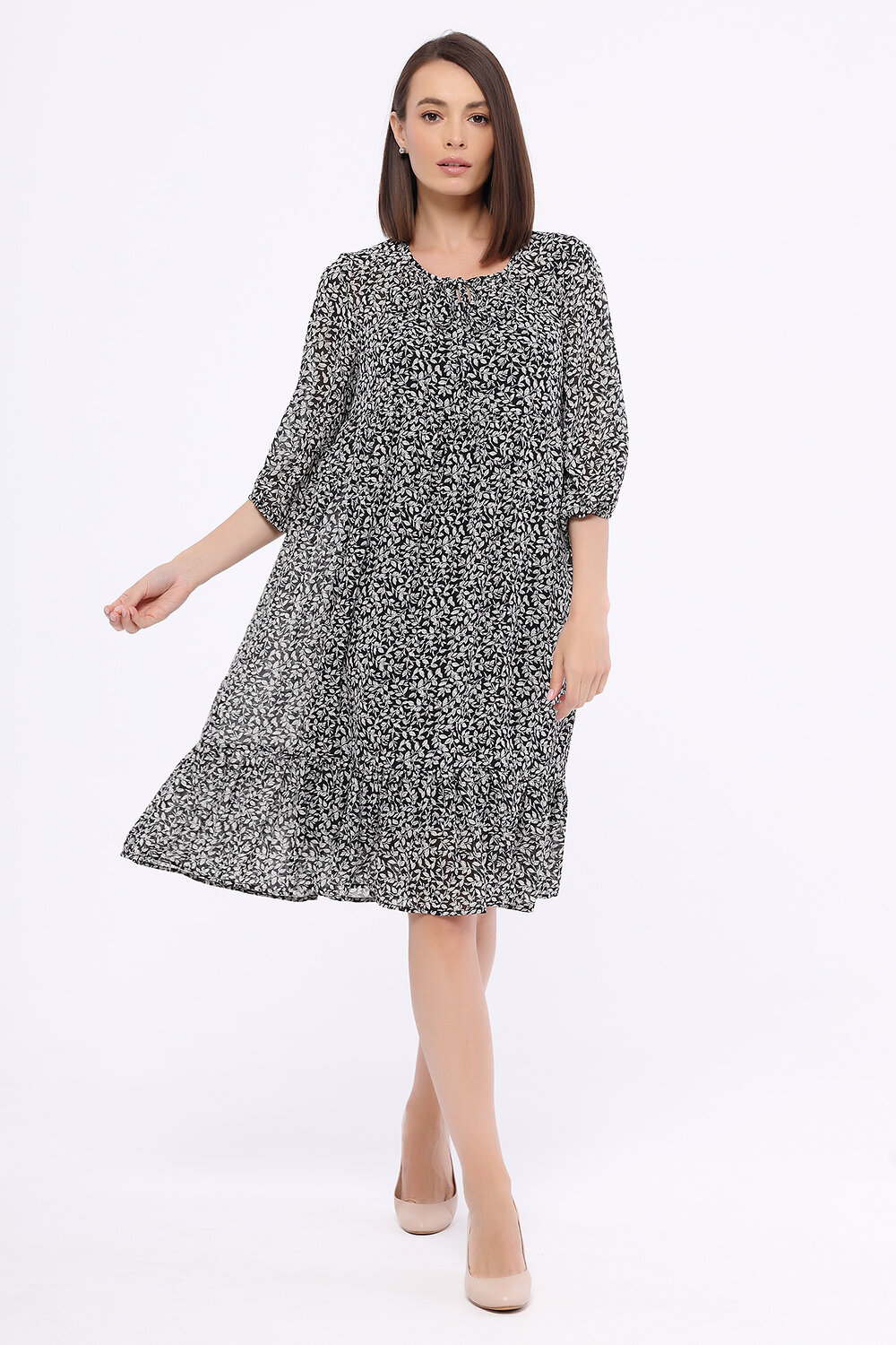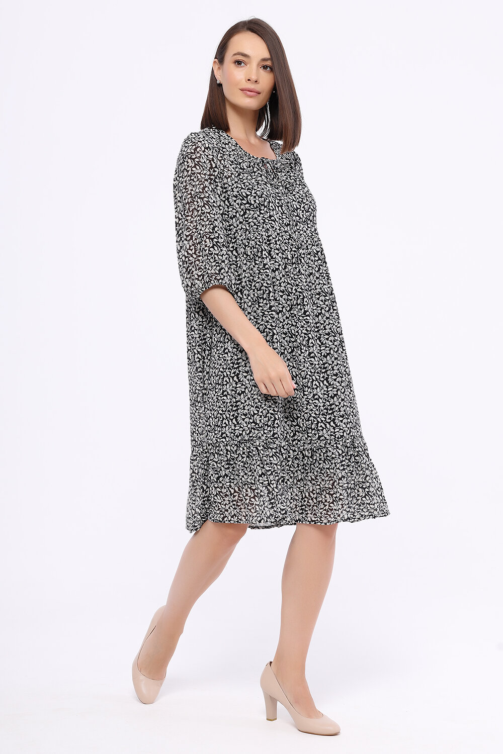 В составе платья полиэстер 100%. Вырез горловины - круглый. Без отделки горловины. Рукава до локтя. Без застёжки. Декоративный элемент - оборки. Длина миди. Подкладка - нижнее платье. Крой широкий. Модель платья - прямое. Покрой свободный. Без карманов. Рукав втачной. Рекомендована стирка при температуре не более 30С.