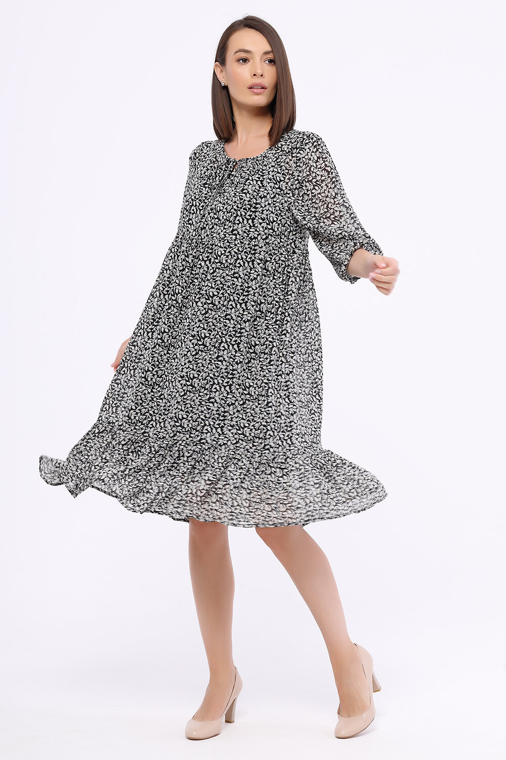 Широкое платье миди с оборками по праву займёт место в Вашем весеннем гардеробе. Округлый вырез, рукава до локтя и длина миди придают образу сдержанности, а свободная широкая юбка с оборками добавит образу романтичности. Под платьем находится подкладочное платье, которое позволит Вам чувствовать себя комфортно и свободно.