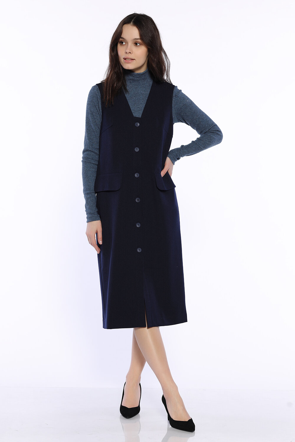 Комфортное осеннее платье-сарафан длины миди придаст особого шарма осенним образам. На передней части платья декоративные клапана, карманов нет. Осенью наденьте под платье свитер,джемпер или водолазку.