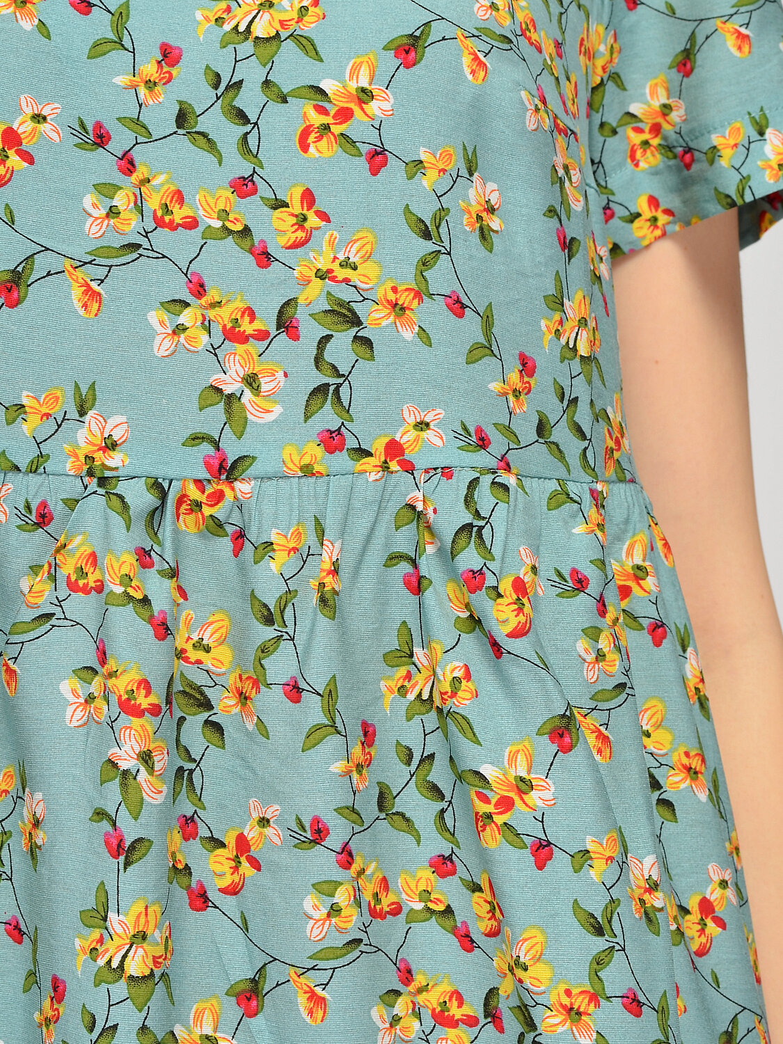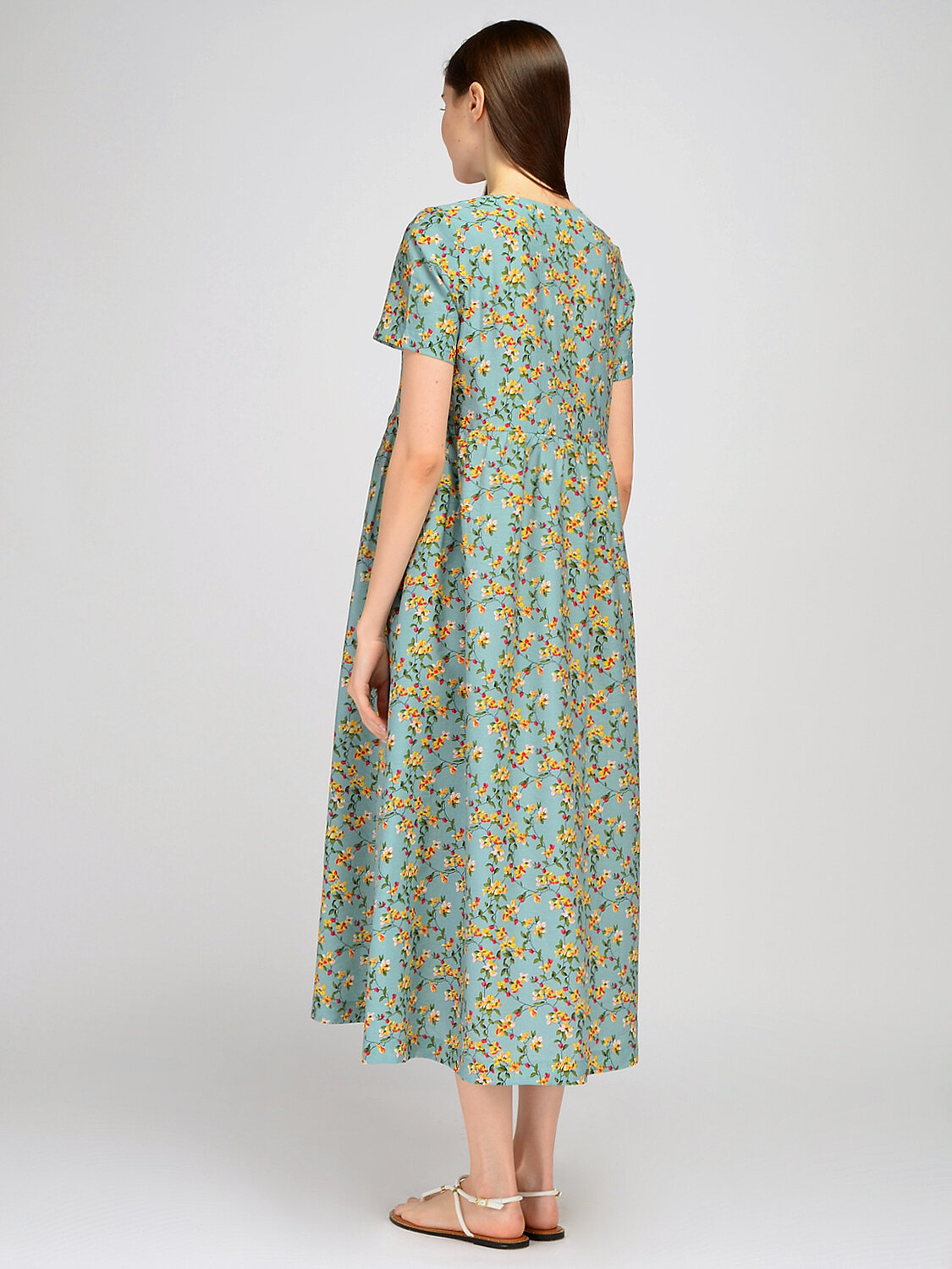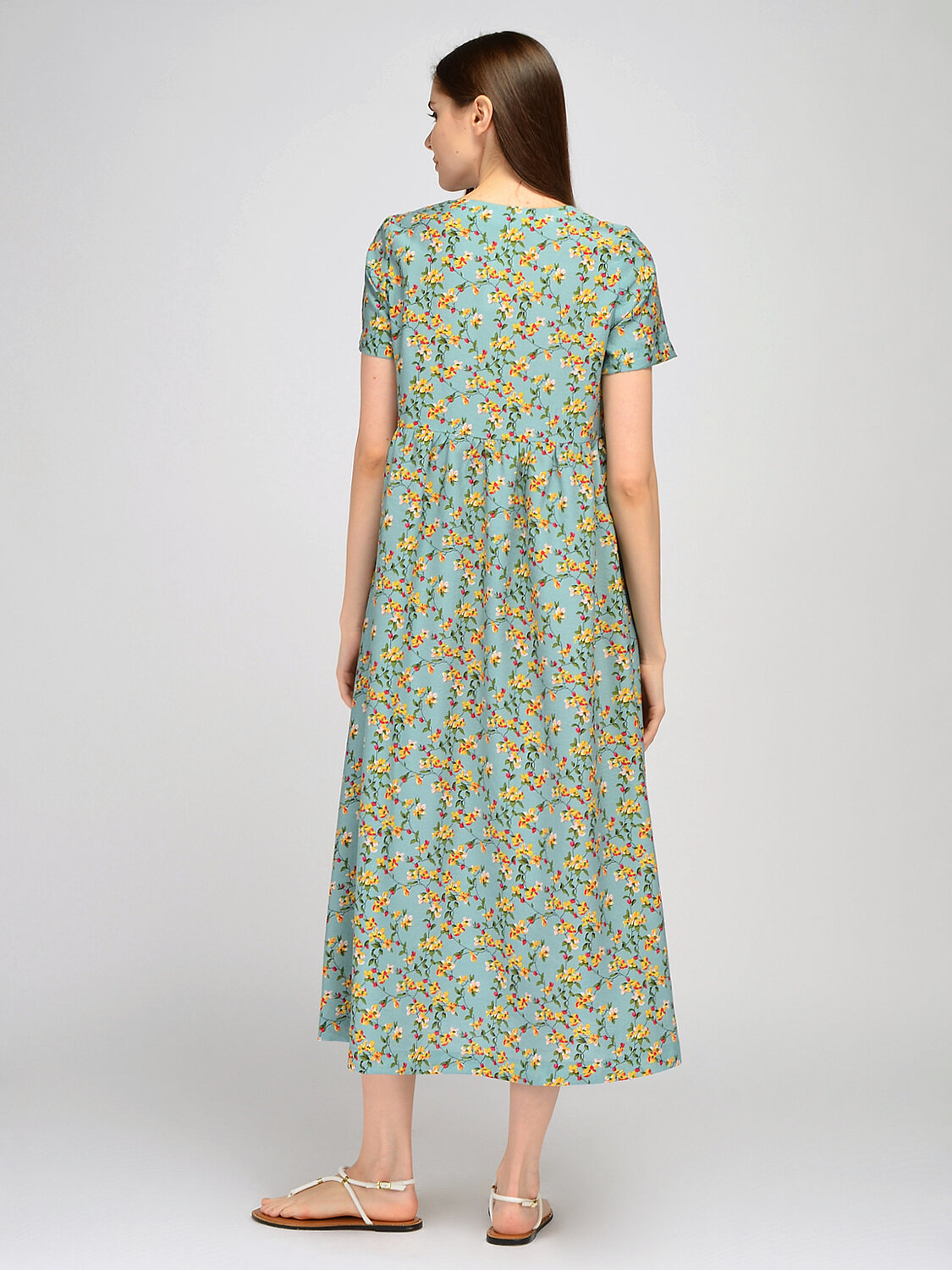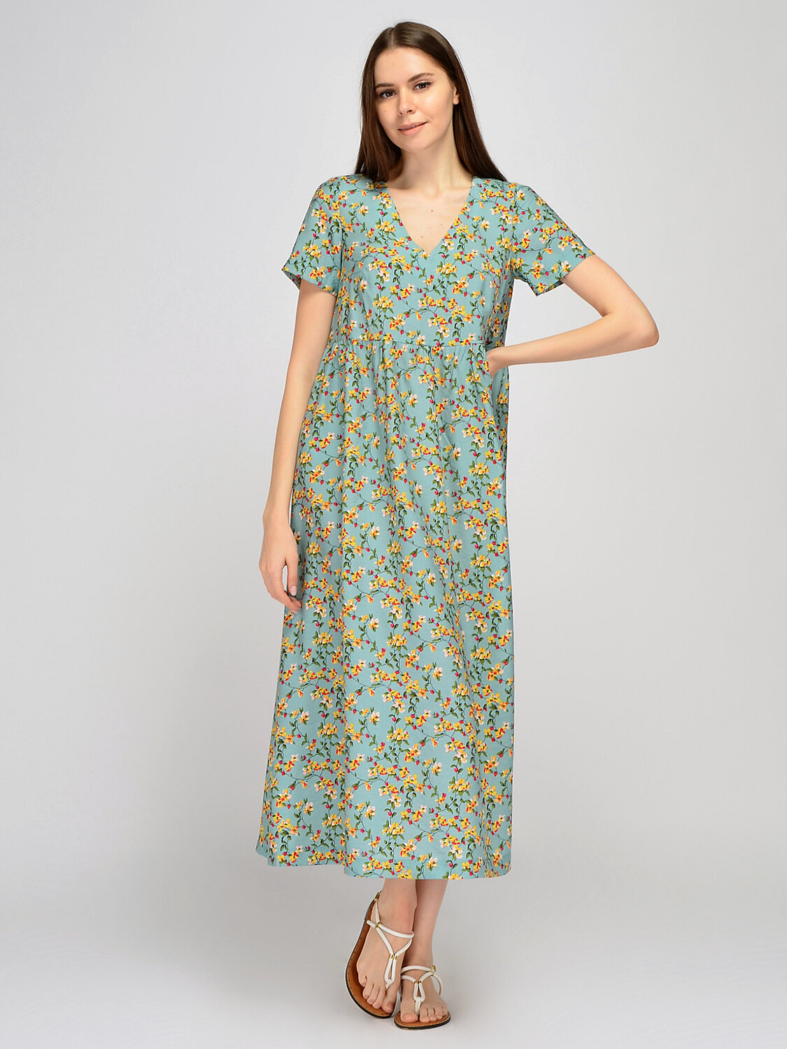 Платье макси с коротким рукавом. Базовое платье макси с коротким рукавом добавит Вашему летнему гардеробу романтичного настроения. Деликатный вырез подчеркивает ключицу, а длина макси изящно приоткроет щиколотку. На линии талии проложена аккуратная строчка, которая визуально сужает талию и создает правильные пропорции тела. Широкий крой платья обеспечит непревзойдённое ощущение комфорта и свободы в жаркое время года. V образный вырез. Без отделки горловины. Рукава короткие. Рукава втачные. Без застежки. Декоративный элемент драпировка. Длина макси. Крой широкий. Без карманов. Рекомендована стирка при температуре не более 30С. Наденьте платье макси с коротким рукавом на работу, на прогулку или на свидание. Свободный фасон платья, дополненный обувью на высоком ходу, придаст Вашему образу легкости и женственности. Подберите к платью небольшую сумочку через плечо и летние аксессуары.